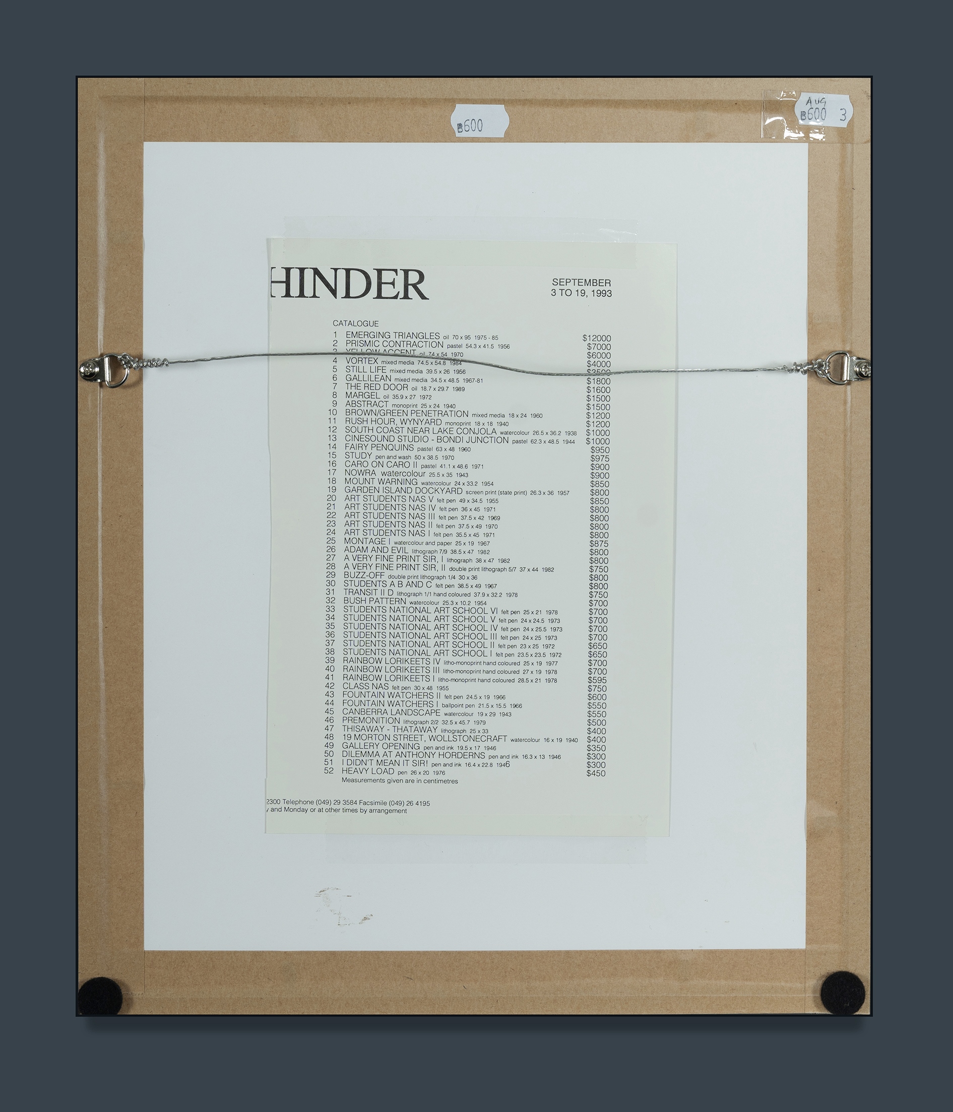 HINDER, F C (Frank) (1906-1992) 'Rainbow Lorikeets IV,' 1977. Litho -monoprint 25x19.5cm (sight) PROVENANCE: Frank Hinder Survey Exhibition, Von Bertouch Galleries, Newcastle, 1993, no. 39 (catalogue affixed verso).Estimate $400-600