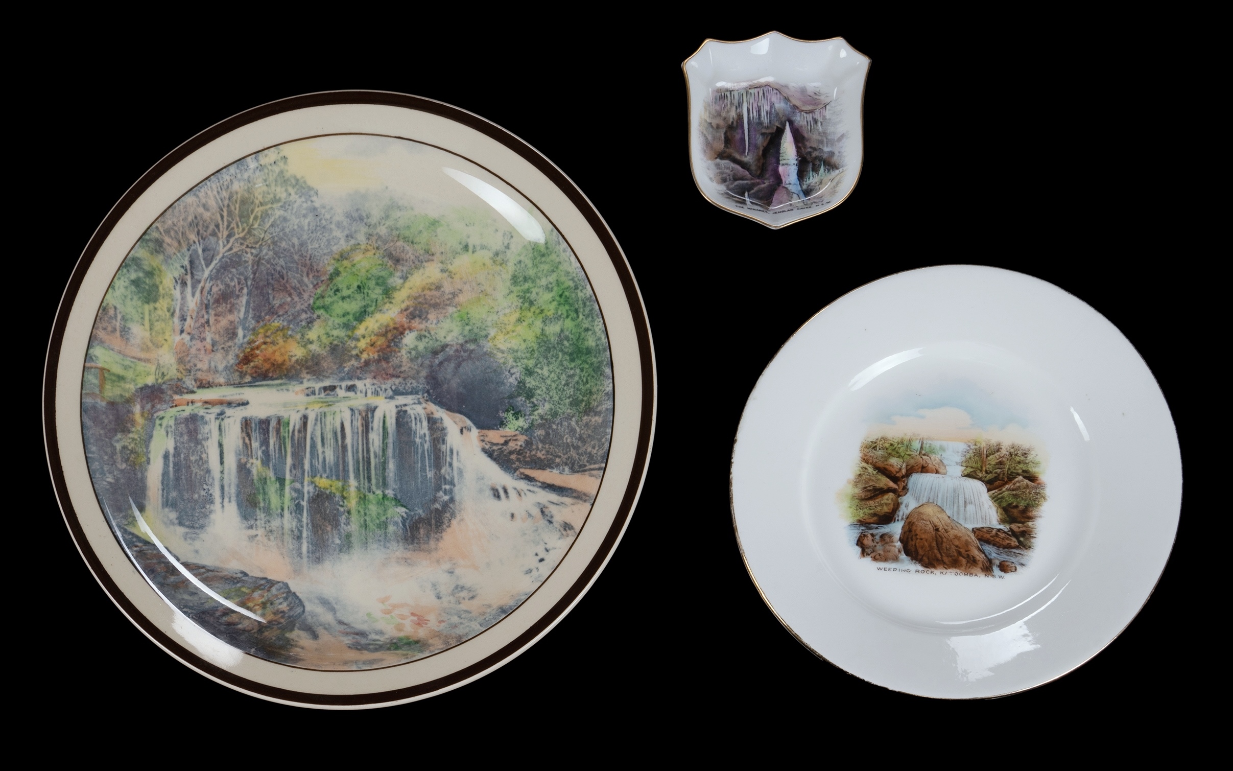 8 Blue Mountains Souvenir Items. Royal Doulton 'The Weeping Rock, Blue Mtns' plate; and five other porcelain items by Shelley and other makers featuring Jenolan Caves, The Three Sisters, Katoomba Falls and Bridal Veil Falls. (Rm4)Estimate $100-150