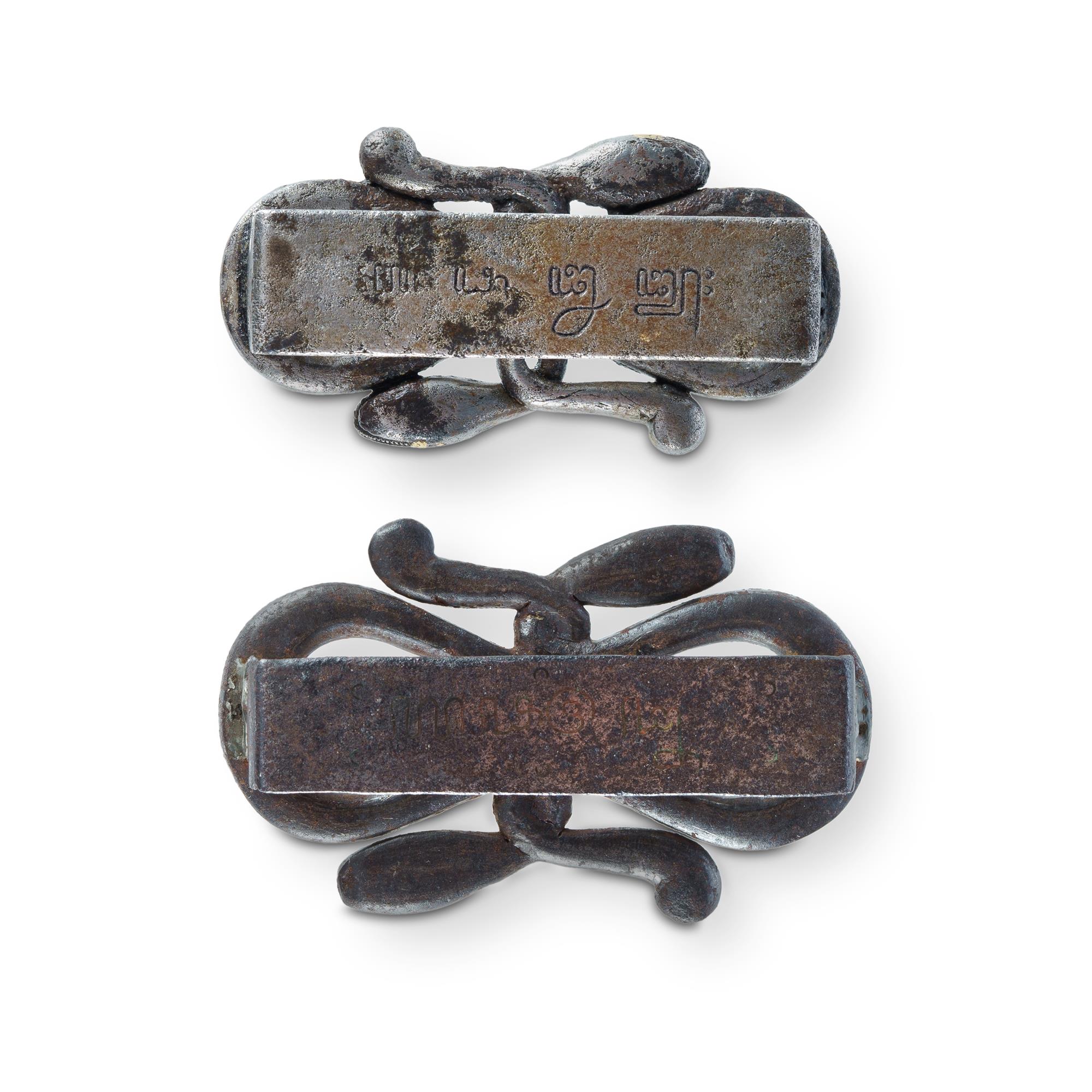 Thirteen Surakarta Court Belt Buckles. Early to mid 19th C buckles worn at the Sultan's court of Surakarta, Java, Indonesia. Iron with gold and 'suasa' inlay. Typical entwined snake motif. 4 with diamond set eyes, one set with rubies and turquoise. In various conditions, some losses and repairs.