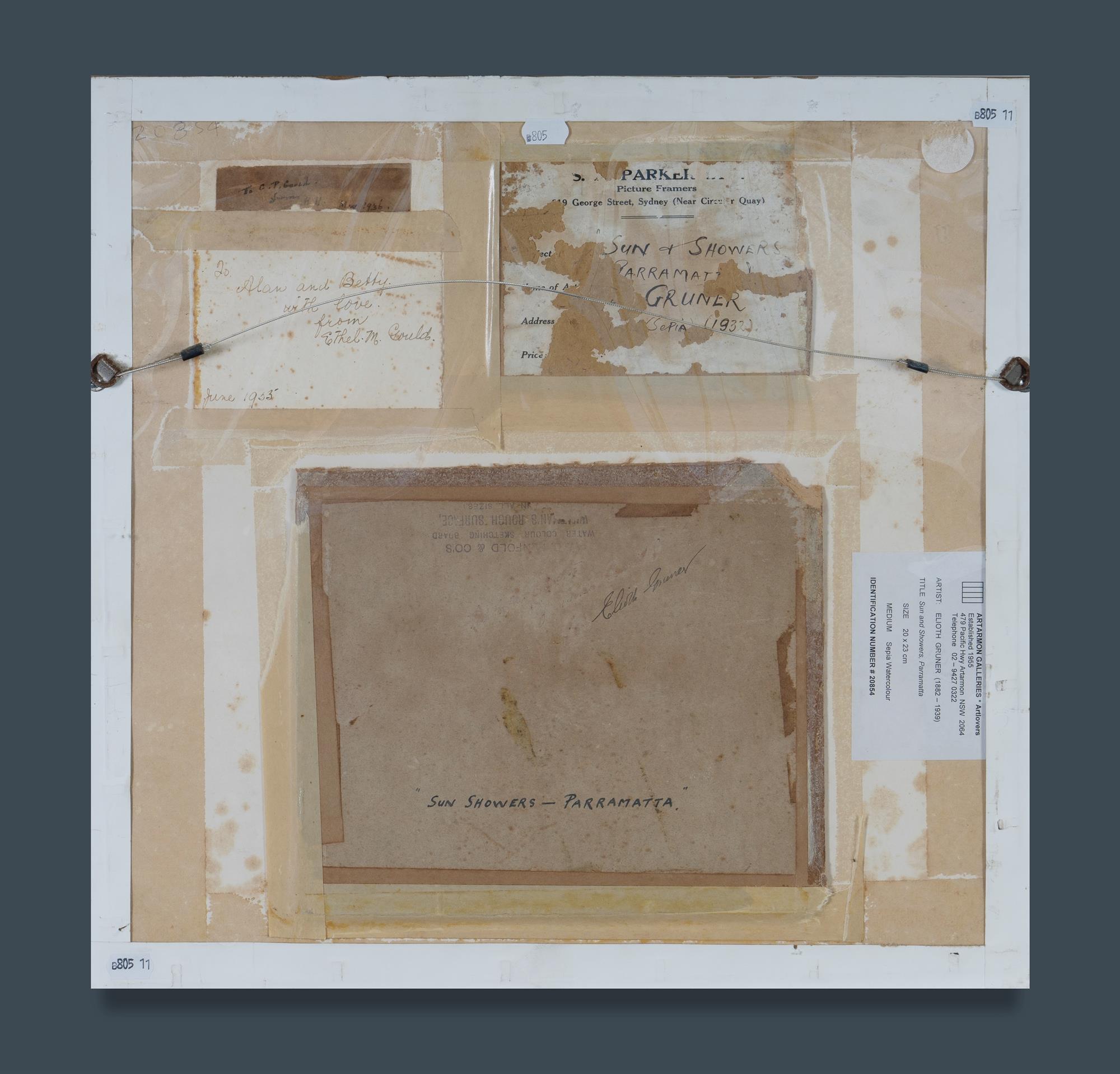 GRUNER, Elioth (1882-1939) 'Sun and Showers, Parramatta,' 1932. Signed indistinctly lower right. Old labels and receipts verso incl. S.A. Parker Sydney and Artarmon Galleries (identification number #20854) where purchased by current owner March 15th 2007. Original invoice included, with provenance notes. Sepia Watercolour 19.5x23cm