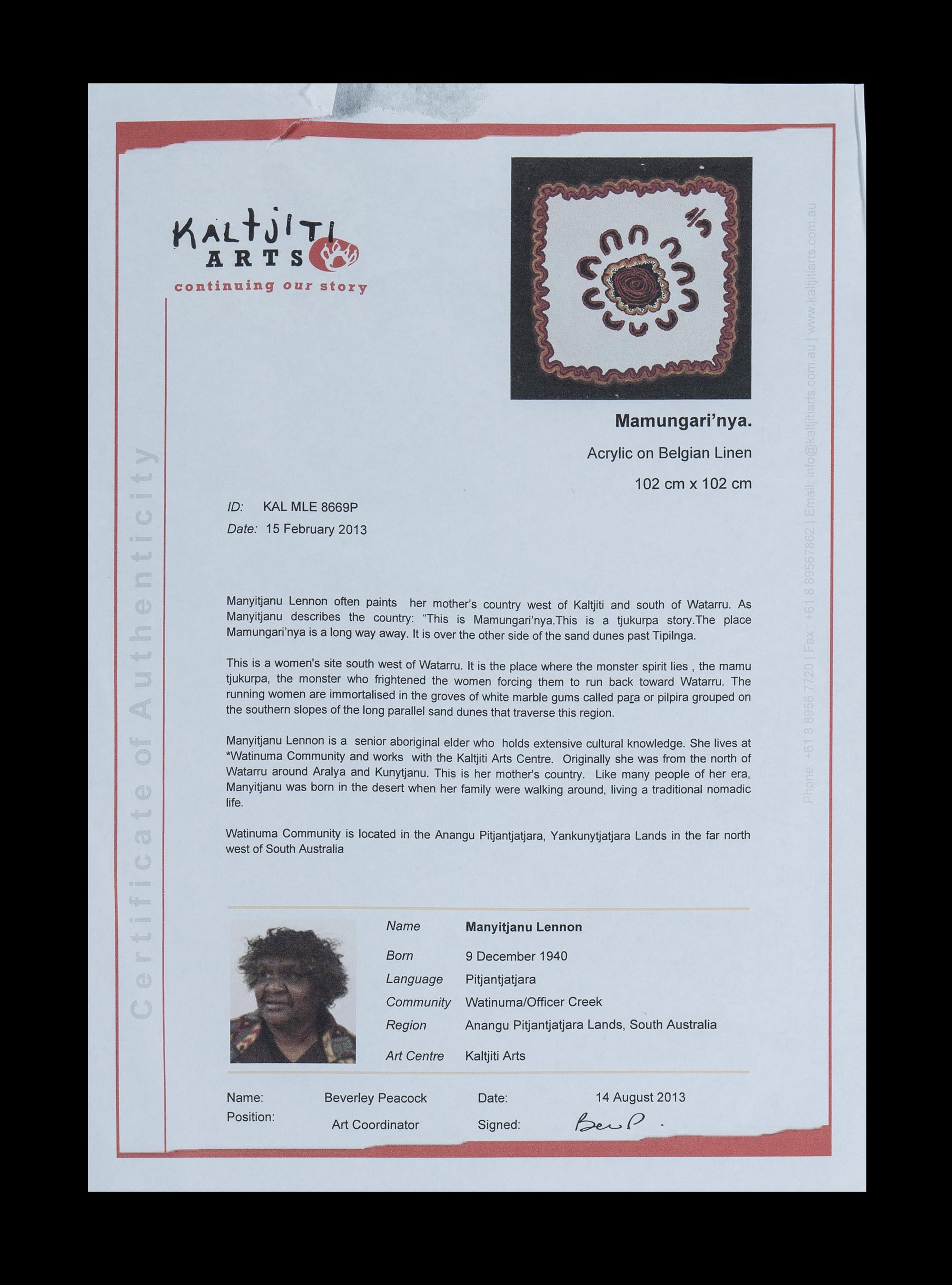 LENNON, Manyitjanu (Aboriginal b.1940) 'Mamungarinya,' 2013. Kaltjiti Arts cat #KAL MLE 8669P. Certificate of authenticity included. Acrylic on Linen 102x102cmEstimate $400-700