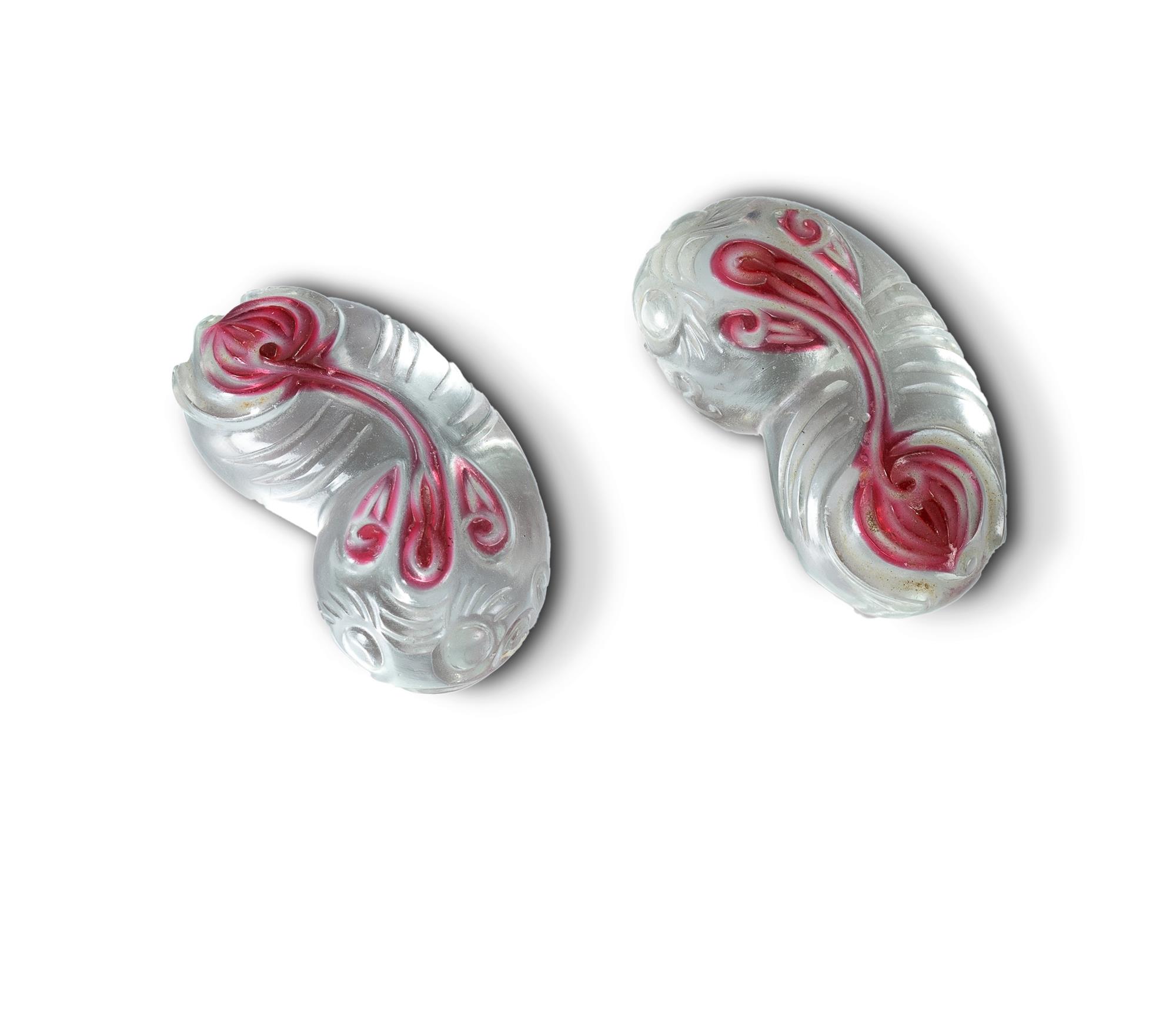 Pr Chinese Peking Glass Carvings. Modelled as Shishi Dogs. Red over clear glass. (L5.5cm each) PROVENANCE: Estate Late Prue Socha, Sydney.Estimate $50-100
