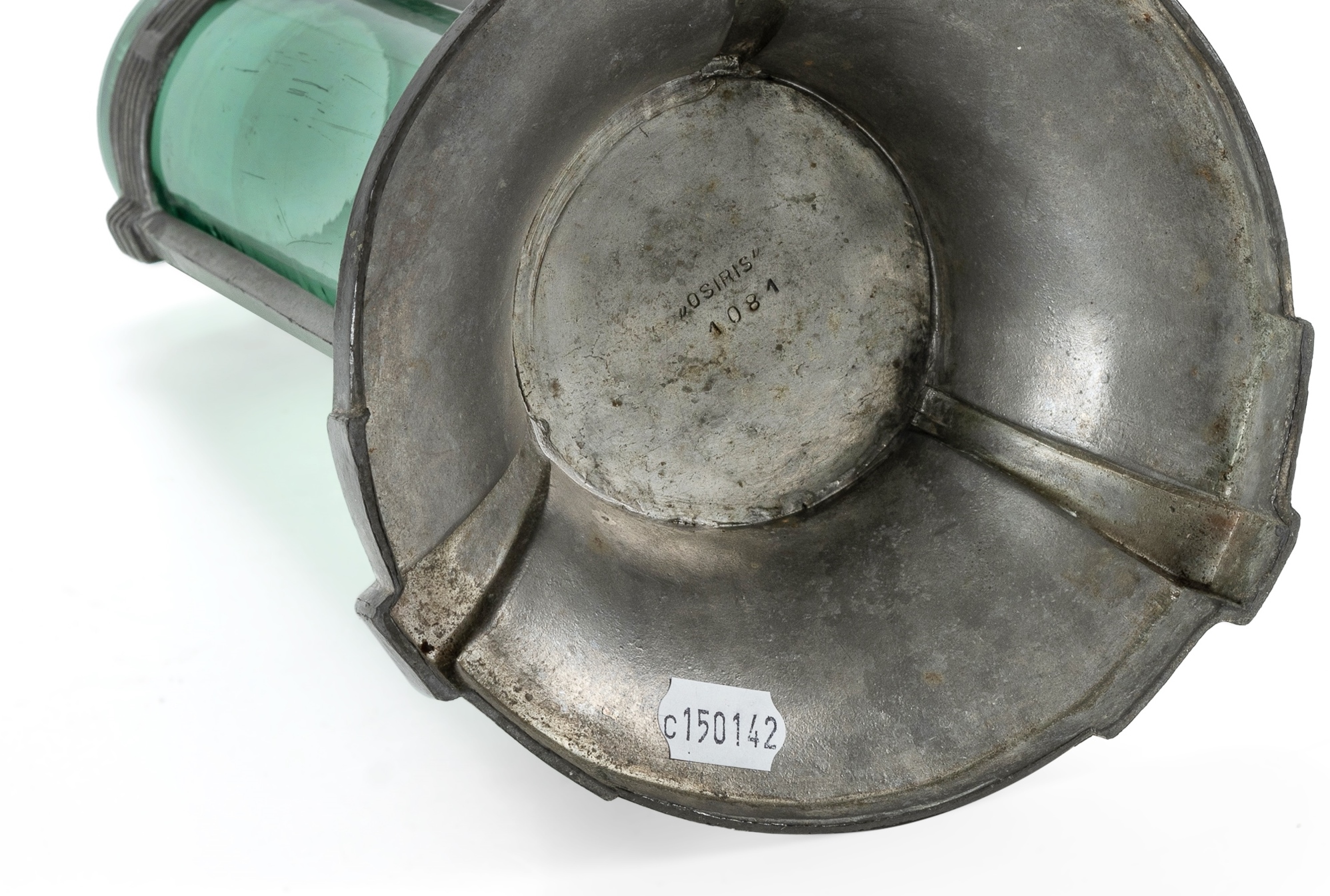 Walter Scherf & Co. Nuremberg 'Osiris' Pewter and Green Glass Vase. Model 1081 possibly designed by J.M. Olbrich or Peter Behrens. (H28cm)