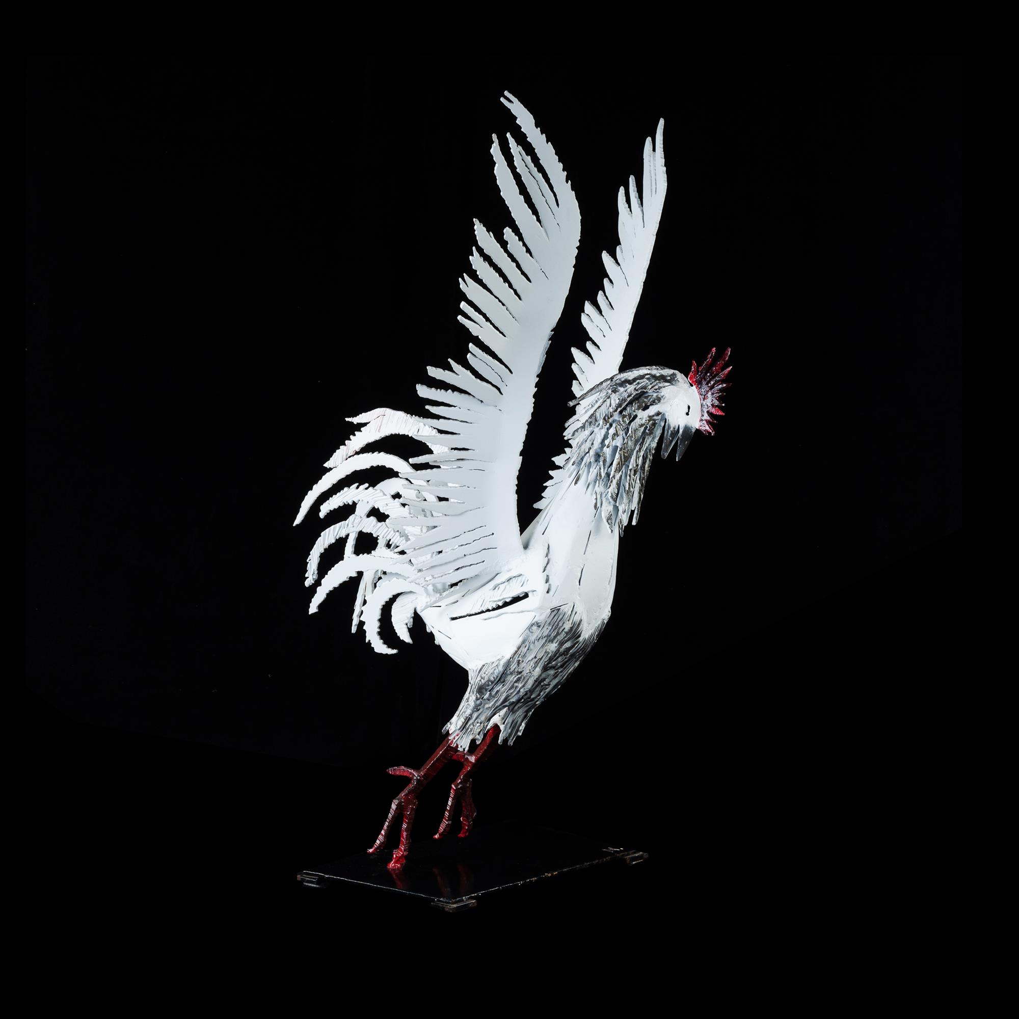 SEFFRIN, Nickolaus (German/Australian b.1931) 'Fighting Cock/Rooster' Initialled 'N' to base. Mild Steel with Powdercoating & Applied Colour 78x38x46cm PROVENANCE: Adrien Seffrin, son of the artist.Estimate $800-1,500