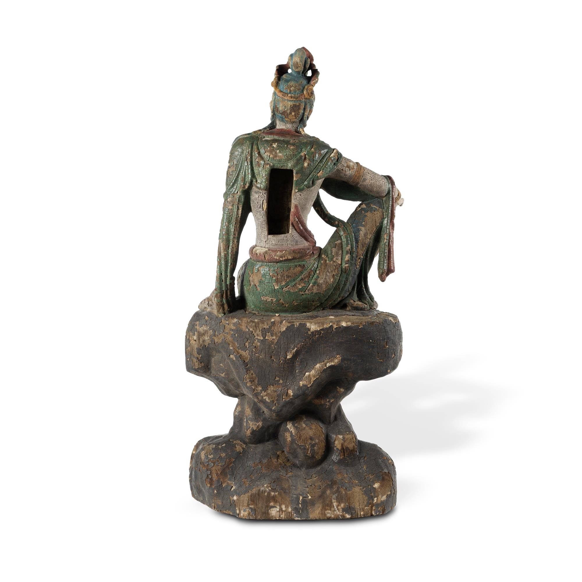 Qing Dynasty Polychrome Painted Wood Figure of Avalokitesvara (Guanyin) Seated in water, moon pose. (H62cm)Estimate $500-1,000