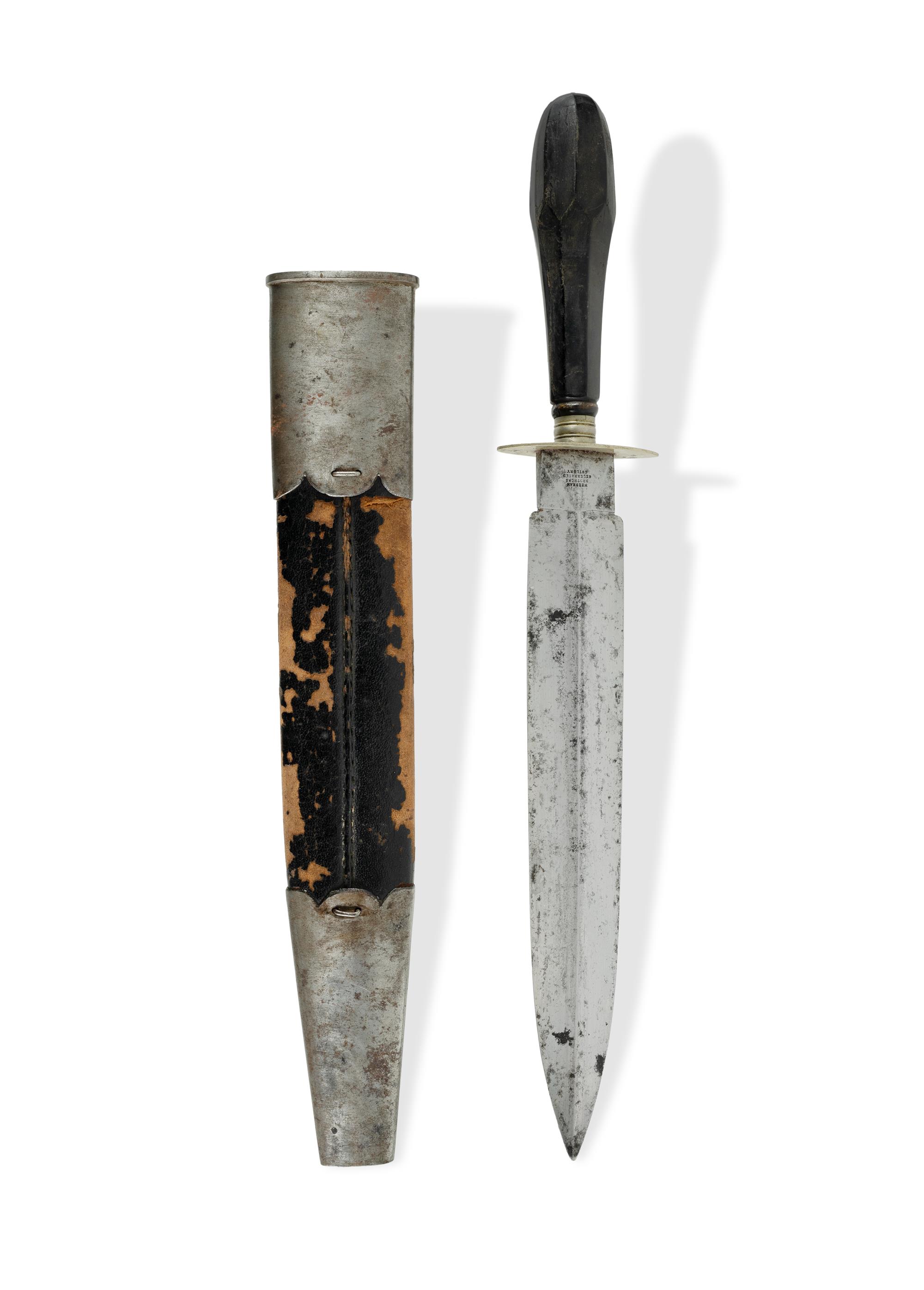 Mid 19th C Sheffield Bowie Knife Needham Brothers. Large spearpoint blade, ricasso stamped 'Needham Brothers, Celebrated Cutlery'. German silver oval guard and bolster. Pressed horn octagonal hilt. (L38cm) Ex Archer Collection, Tasmania; ex Ian Cummins Collection. PROVENANCE: From the collection of the late Warren Mallard LITERATURE: 'A Sure Defence, the Bowie Knife Book' 1988, No.49 pp.38-39. Kenneth Burton.Estimate $500-800