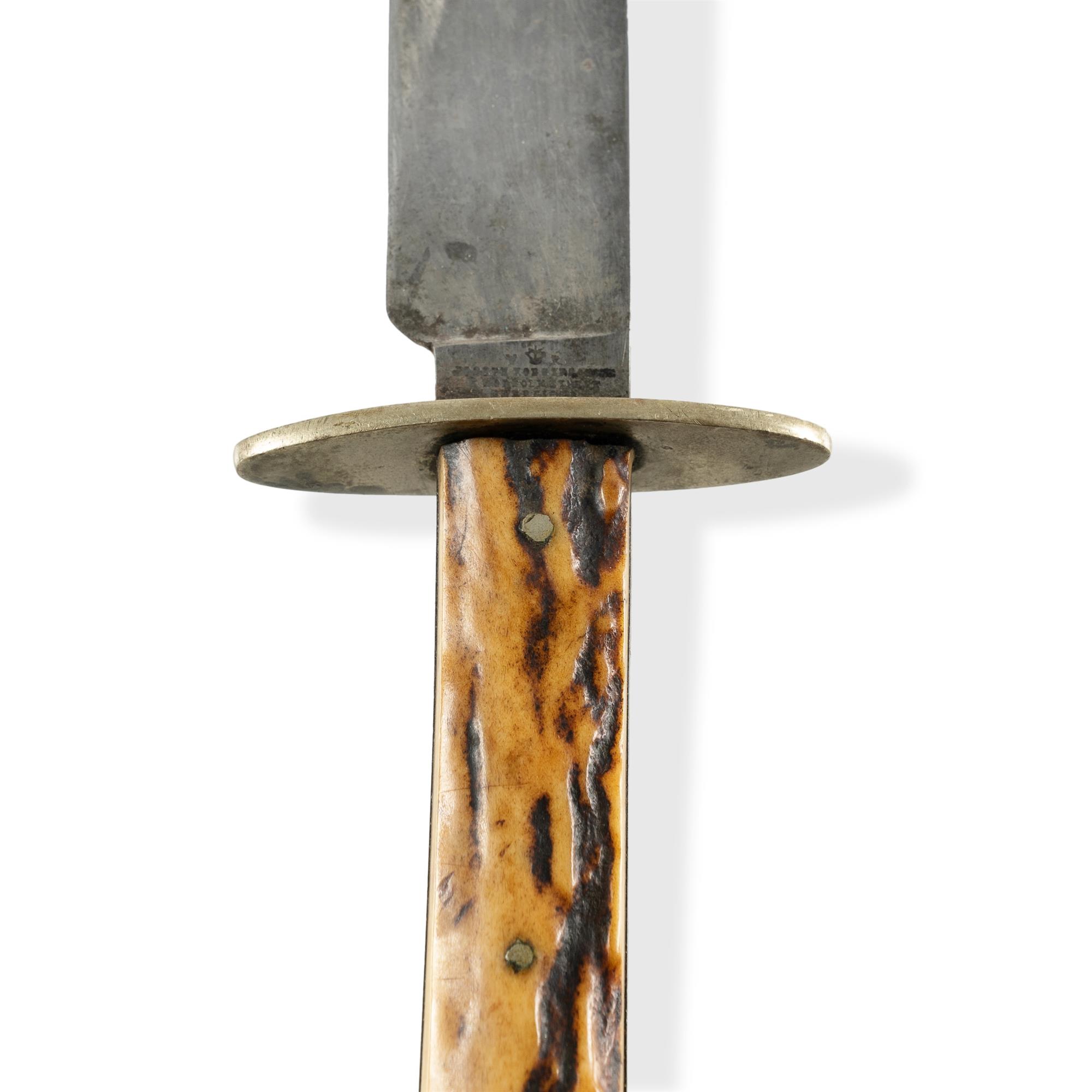Victorian Joseph Rodgers & Sons Bowie Knife Clip pointed blade stamped to ricasso 'V.R. Joseph Rodgers & Sons, 6 Norfolk Street Sheffield'. Oval nickel silver guard, staghorn slab grips fixed by 3 pins. Original leather and nickel silver scabbard with old repair. L34.5cm (incl. scabbard)