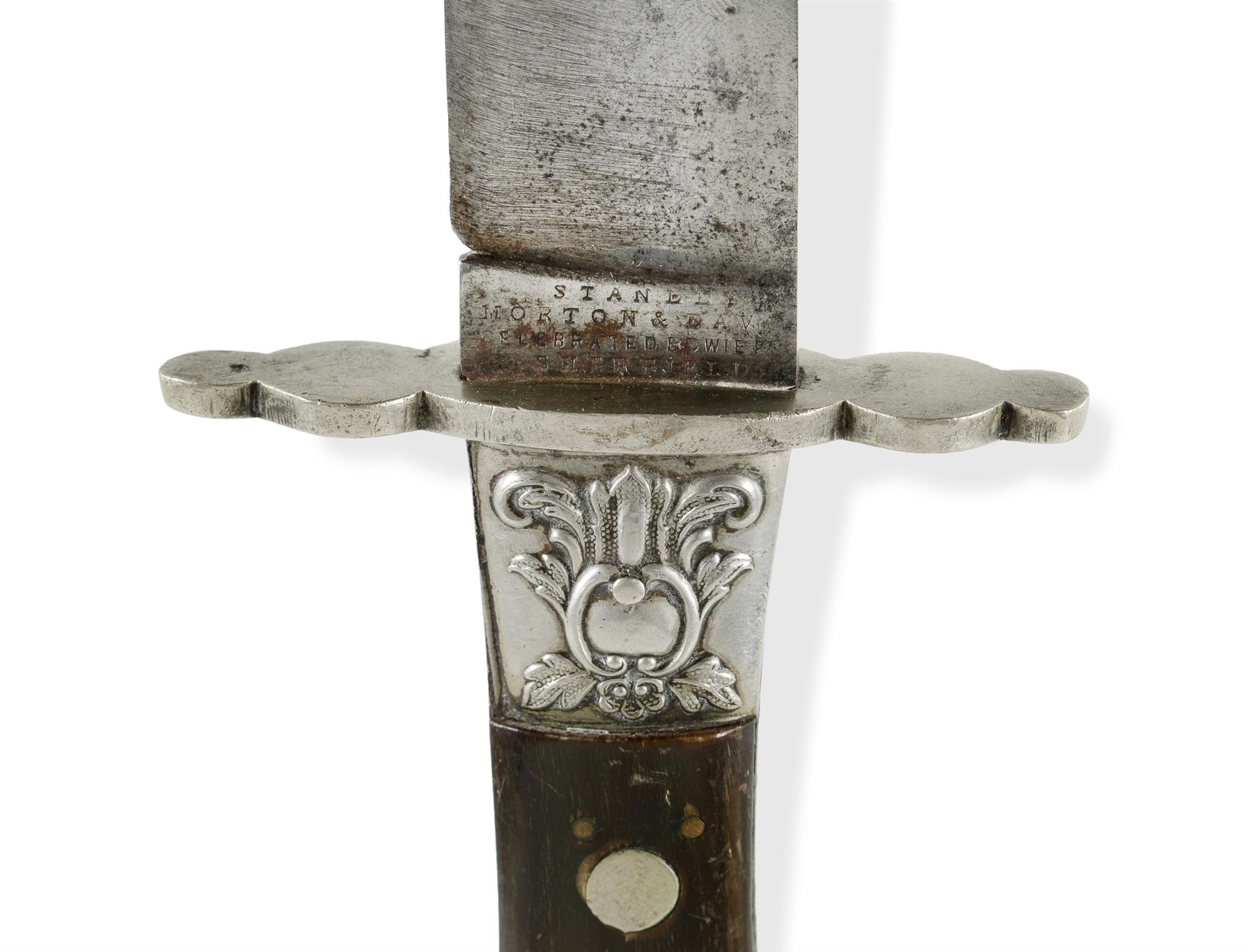 19th C Sheffield Bowie Knife Morton & Davis. Clip point blade with false edge. Faint traces of original etched blade decoration obscured by period sharpening grind marks. The ricasso stamped 'Stanley Morton & Davis, celebrated bowie, Sheffield'. Nickel silver guard, bolster and pommel. Horn scale grips. (L27cm) PROVENANCE: From the collection of the late Warren MallardEstimate $500-1,000