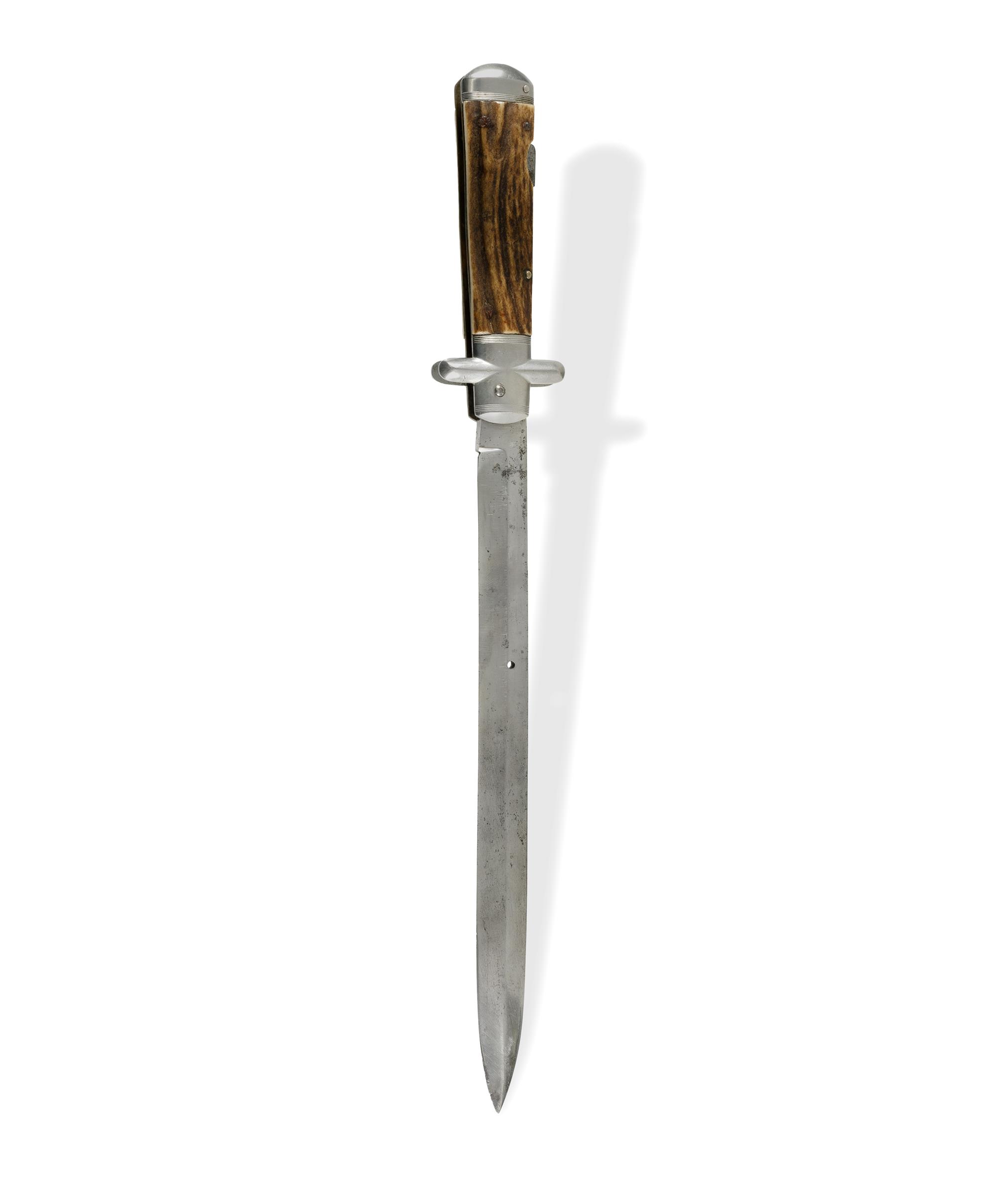 Large Late 19th C Folding Bowie Knife Spearpoint blade. Nickle guard and pommel, and staghorn scale grips. With original leather sheath with nickle chape. L38.5cm (open) PROVENANCE: From the collection of the late Warren MallardEstimate $400-800
