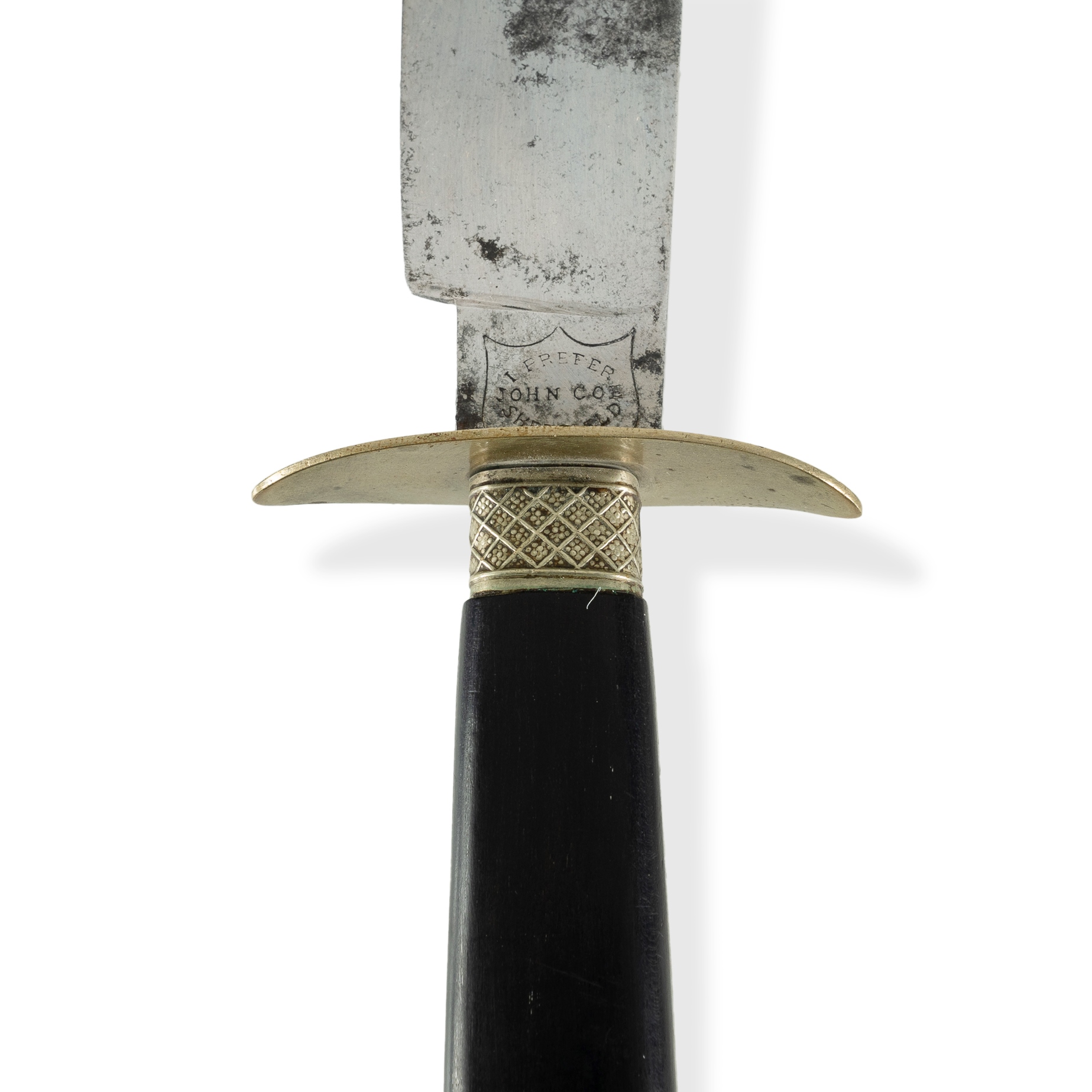 19th C Bowie by John Coe Clip point blade with false edge. Ricasso stamped 'I prefer John Coe Sheffield' within a shield escutcheon. Nickel silver oval guard, bolster and pommel. Ebony grip. In original gold embossed scabbard. (L28.5cm)Estimate $300-500