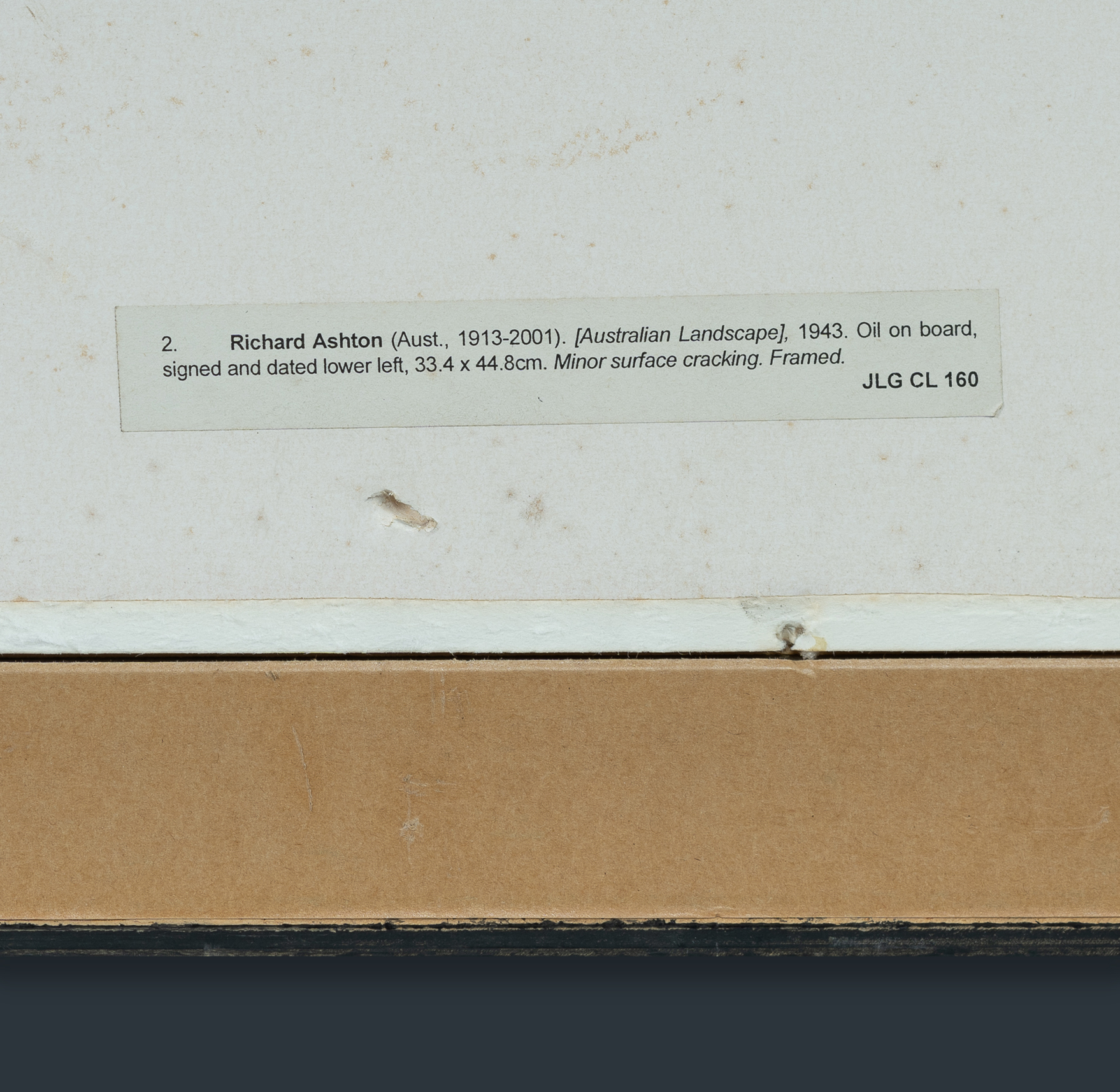 ASHTON, Julian Richard (1913-2001) Untitled (Australian Landscape), 1943. Signed lower left. Oil on Board 33x44.5cmEstimate $800-1,500