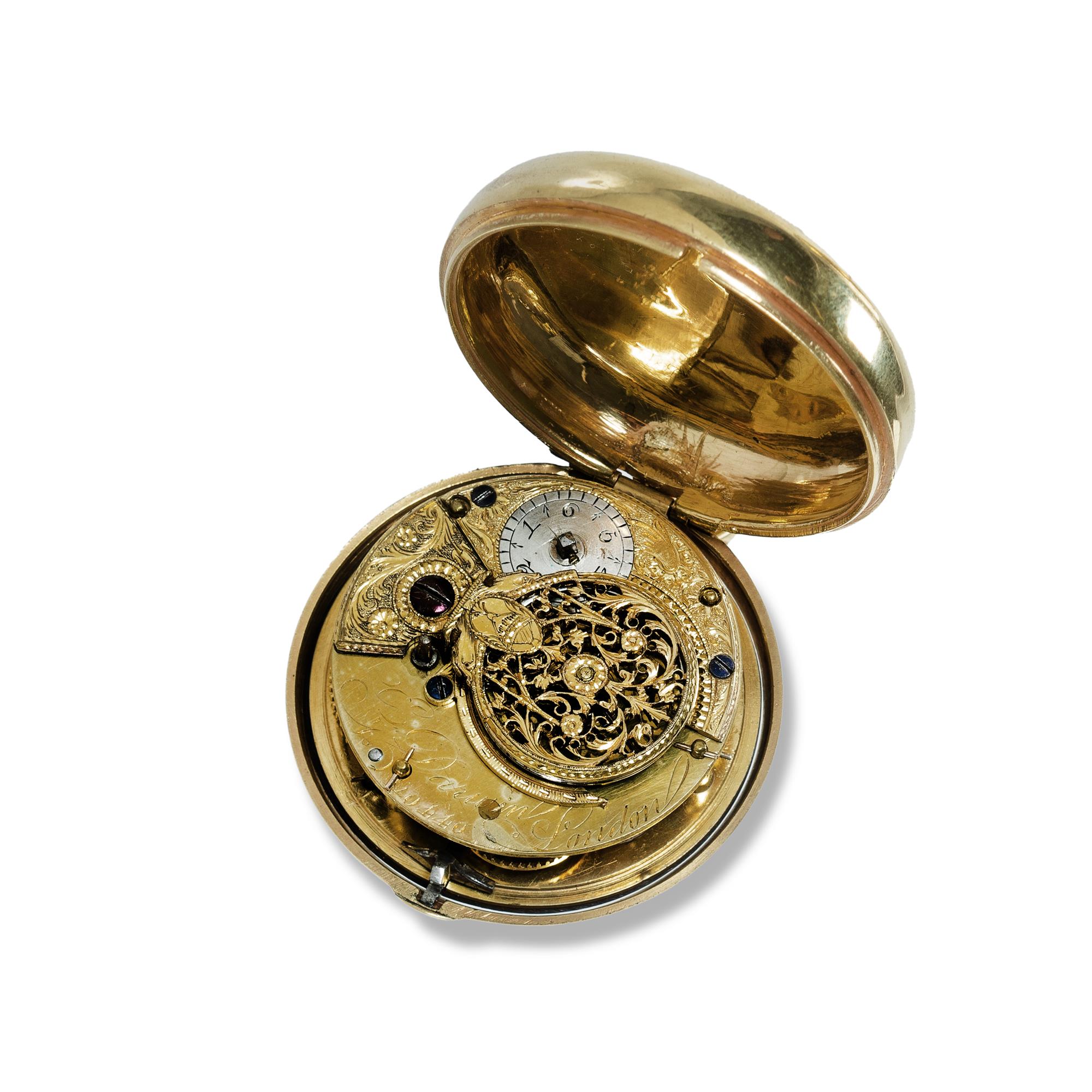 Gilt Pair-Case Keywind Verge Watch by Darwin, London. Good Roman enamel dial. Missing hands and crystal. Running. Watch paper for Beringer & Schwerer of Penzance.Estimate $200-400