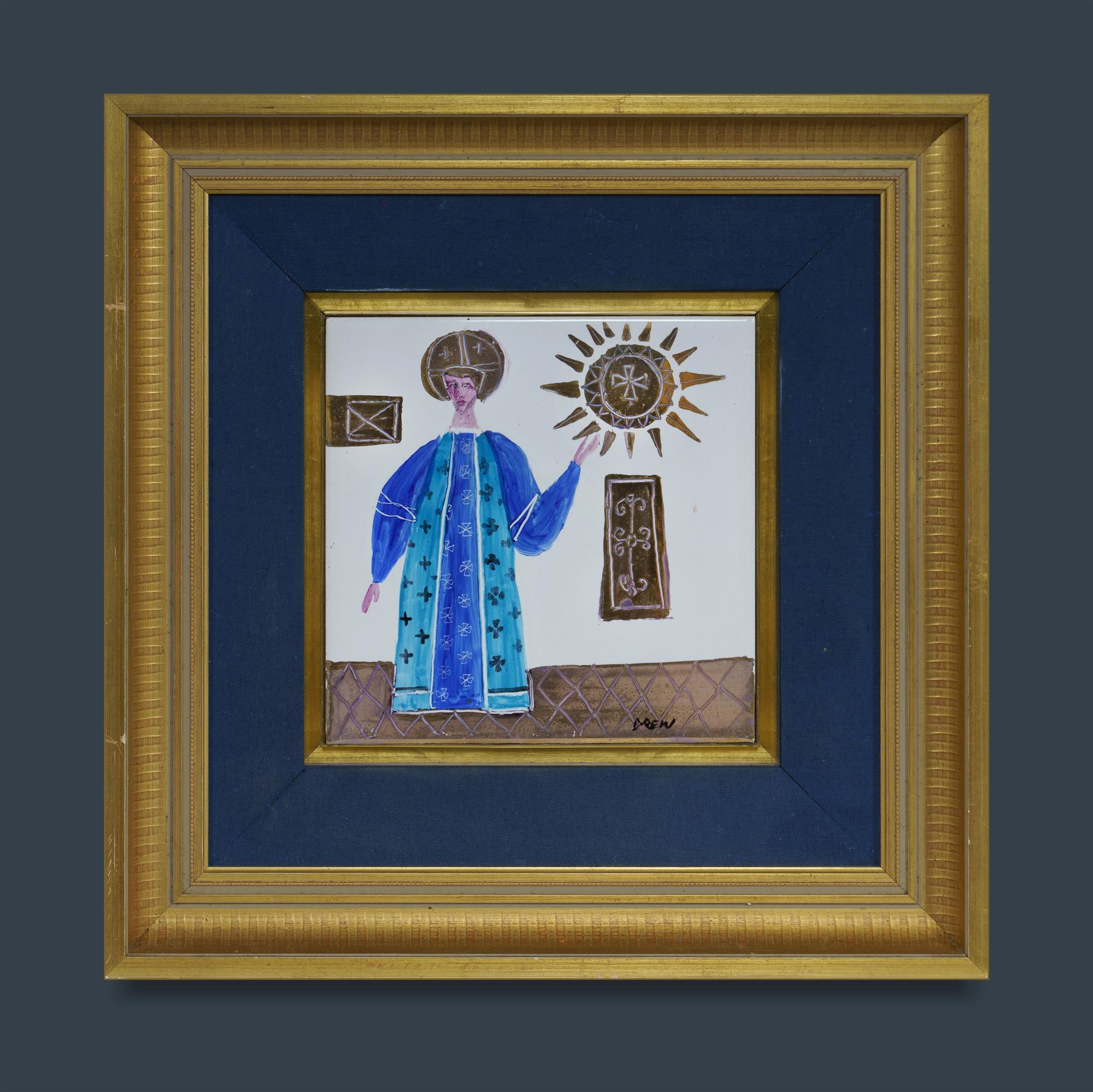 DREW, William (1928-1983) (2) Virgin Mary and Baby Jesus, 1968, mixed media on board (16x8.5cm), signed lower right; and Religious figure, ceramic tile (15x15cm), signed lower right.Estimate $80-150