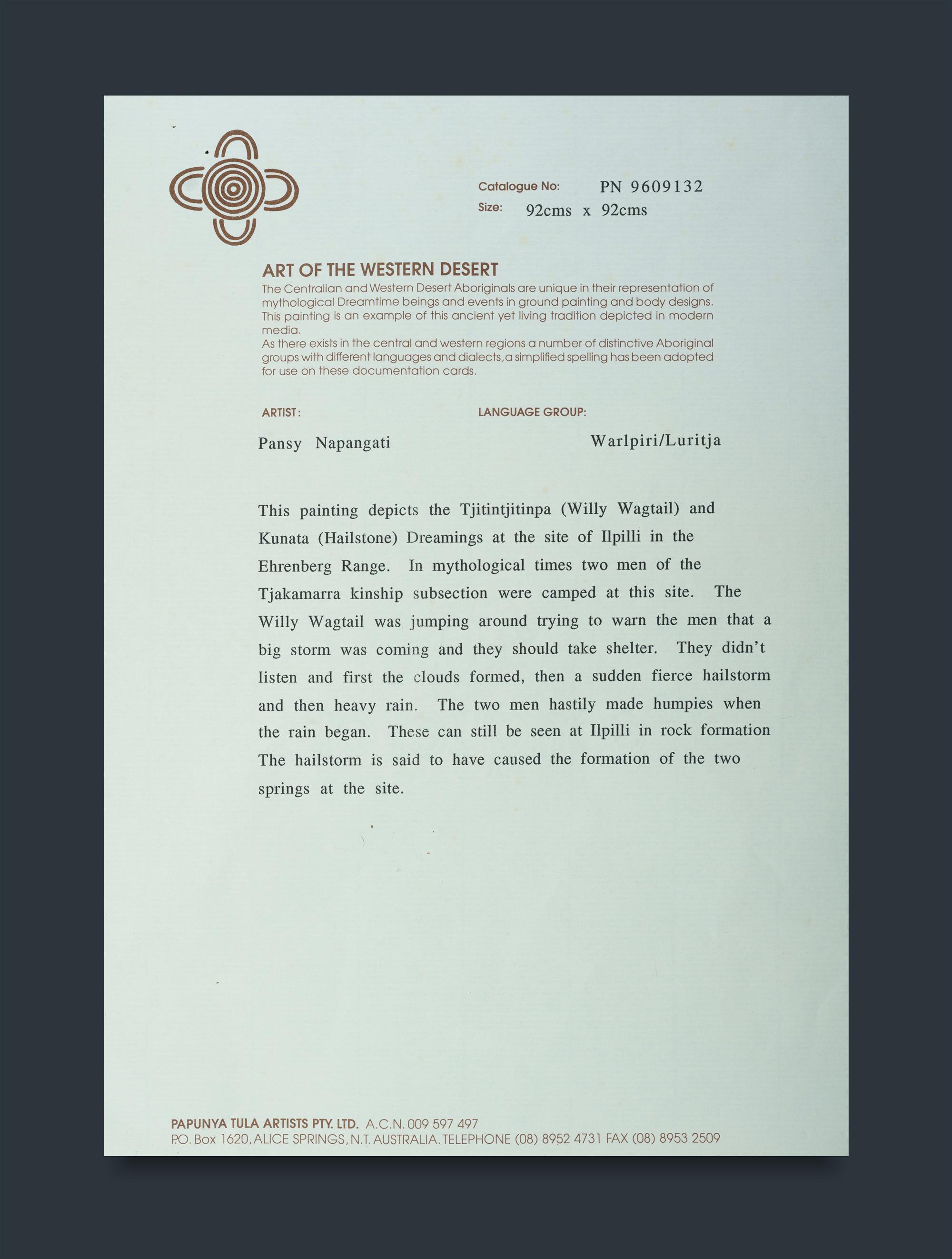 NAPANGARDI, Pansy (Aboriginal born c.1940) 'Storm Dreaming,' 1996. Inscribed with cat #PN9609132, verso. Acrylic on Linen 91.5x90.5cm PROVENANCE: Papunya Tula Pty Ltd, Alice Springs (certificate of authenticity attached verso)Estimate $700-1,200