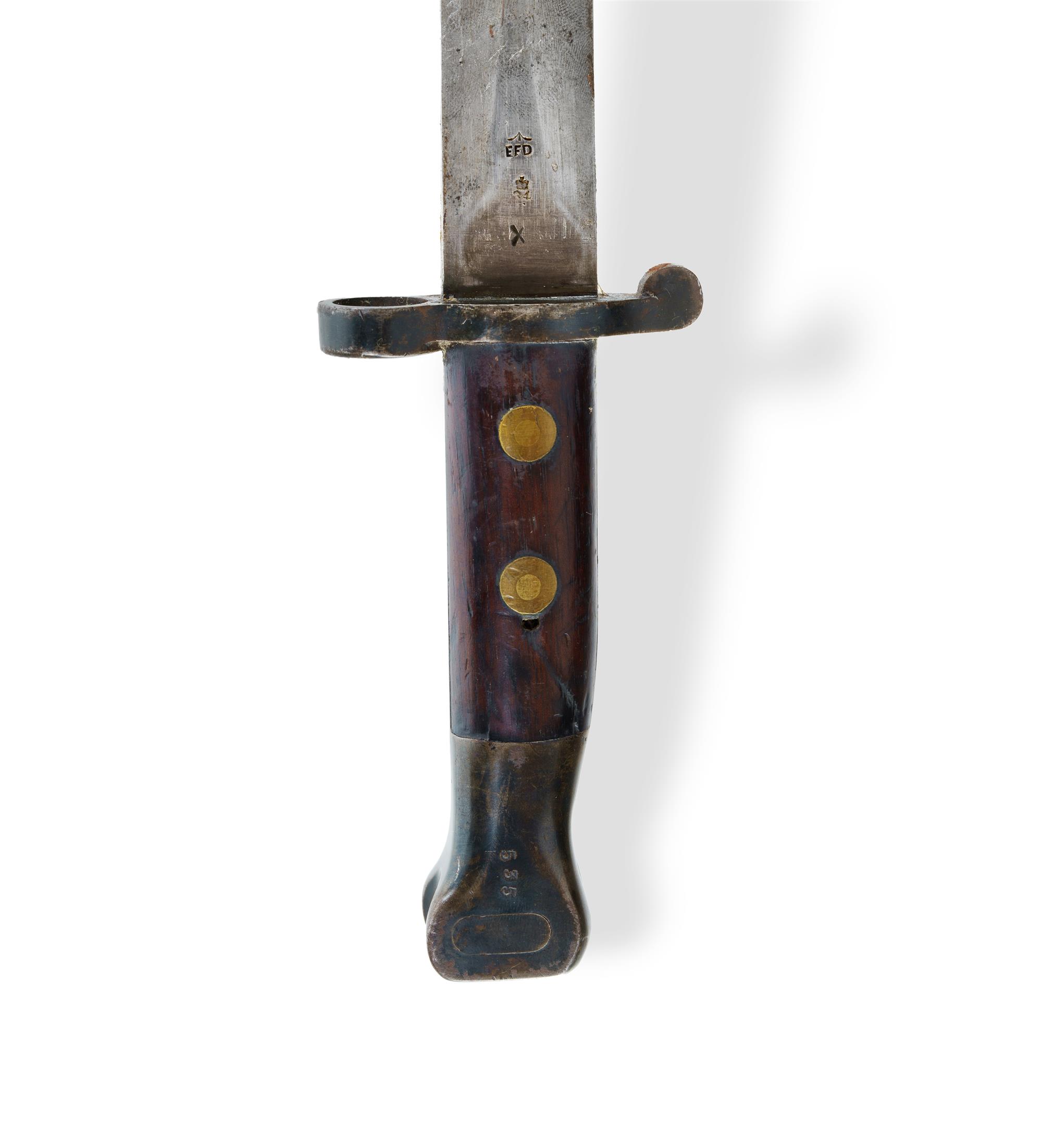 British M1888 Lee-Metford Bayonet With frog and scabbard. Blade marked 'V.R. 98' and 'EDF' for Royal Small Arms Factory, Enfield. (L42.5cm)Estimate $100-200