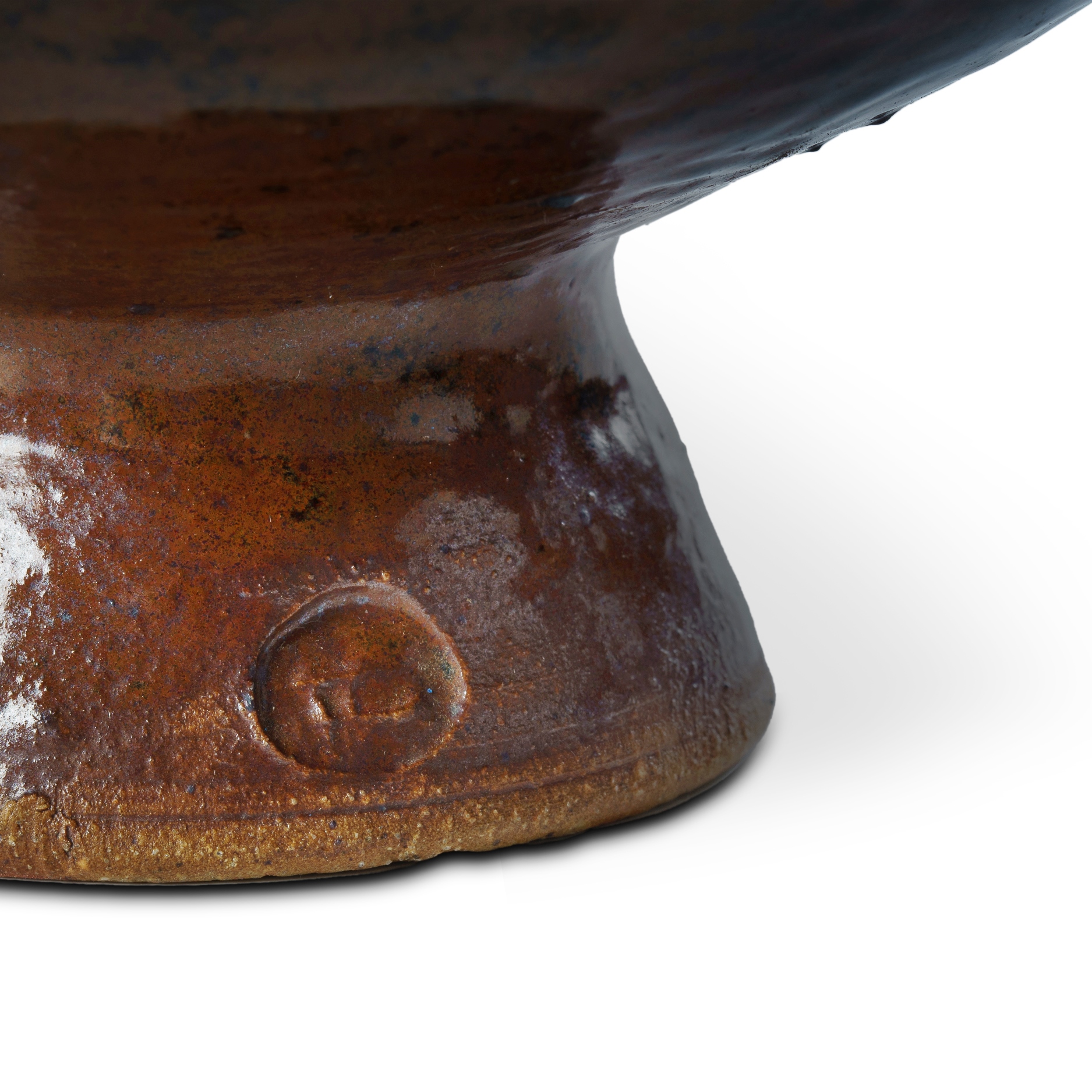 RUSHFORTH Peter (1920-2015) Stoneware Lidded Container, c.1955-65. Raised body over smaller foot. Tenmoku and ash glazed sections with running ash. (H23cm)Estimate $300-500