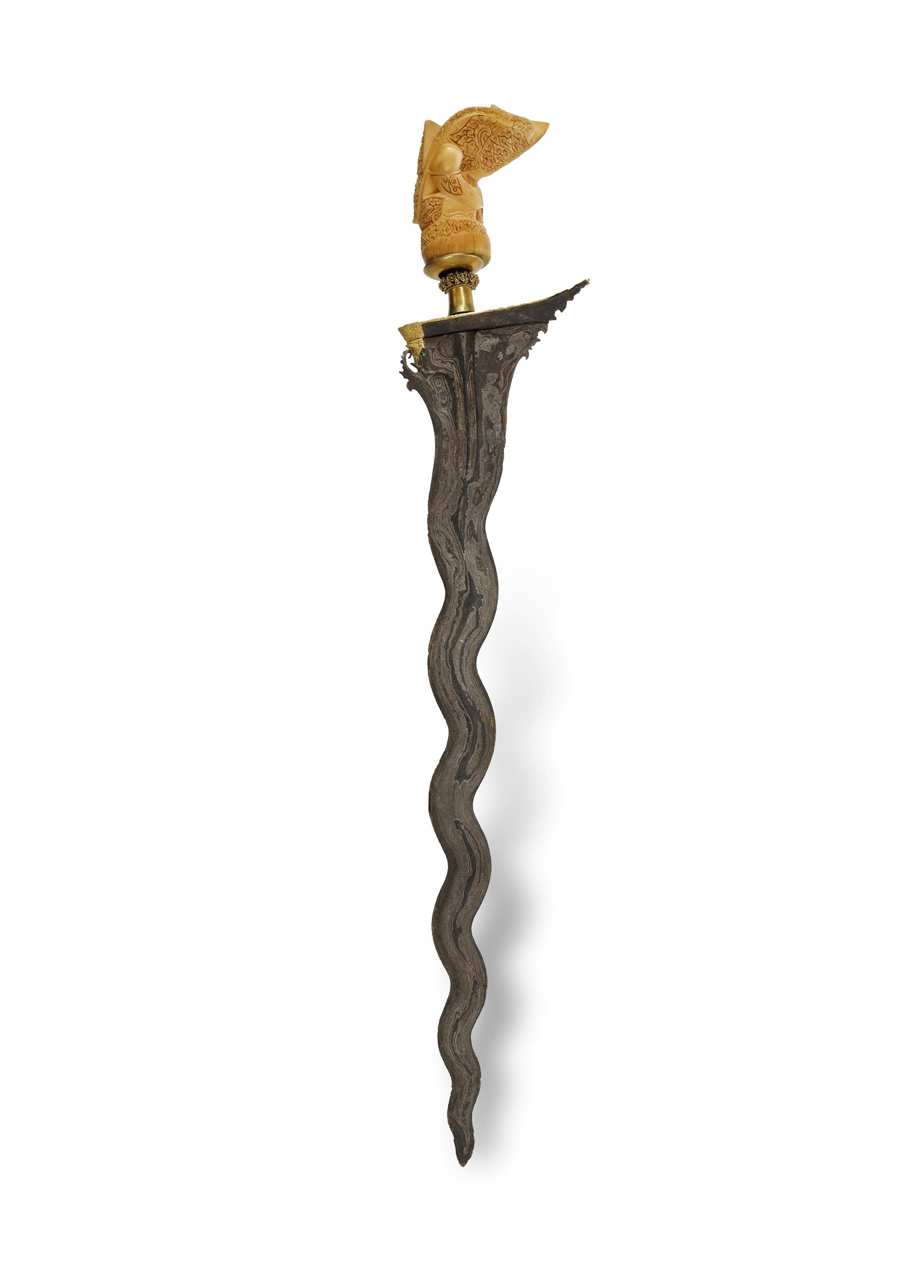 Fine Quality Indonesian Keris Pamor blade with 13 luk (curves), and gold sheet overlay to base of blade. Ivory ancestor figure hilt. NB: ivory export restrictions. (L45cm) PROVENANCE: From the collection of the late Warren MallardEstimate $300-600