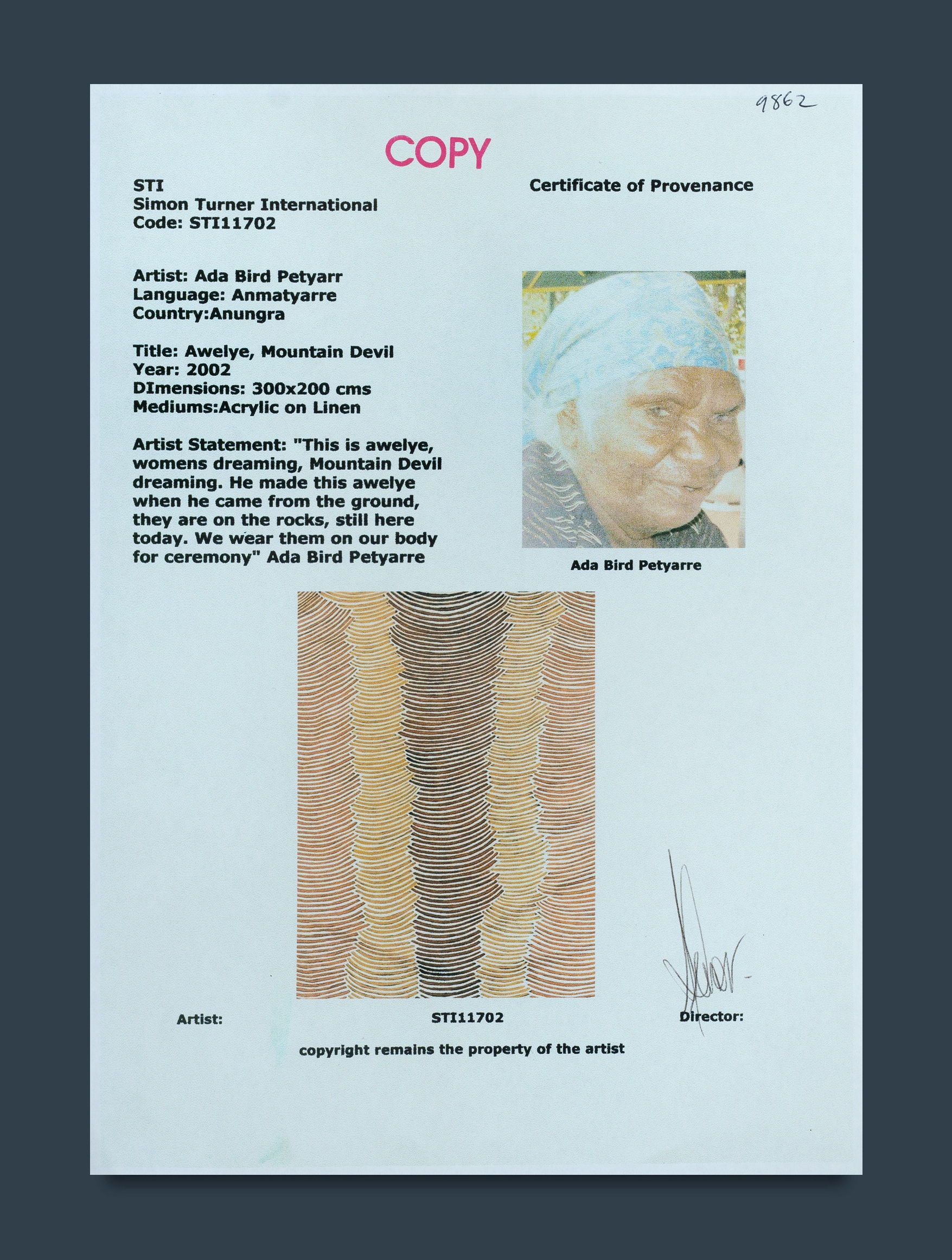 PETYARRE, Ada Bird (Aboriginal c.1930-2009) 'Awelye, Mountain Devil,' 2002. Acrylic on Linen 298x200cm PROVENANCE: Urapuntja Artists, Utopia, NT; Simon Turner International, NSW, cat #STI17002 (includes copy of certificate of authenticity); private collection, NSW. EXHIBITIONS: Woolloongabba Art Gallery, Qld, 2003.Estimate $1,000-2,000
