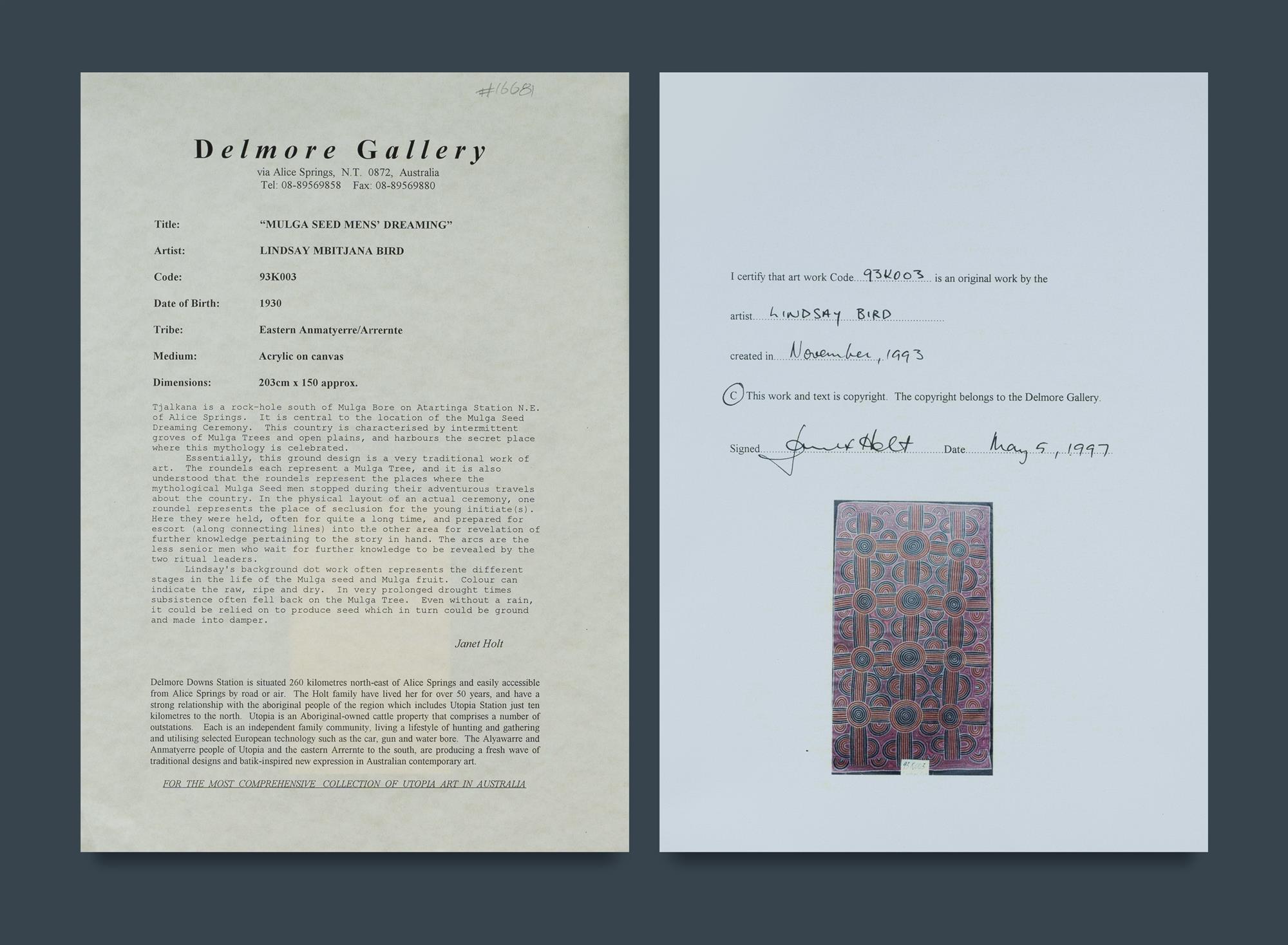 MPETYANE, Lindsay Bird (born c.1935) 'Mulga Seed, Men's Dreaming,' 1993. Inscribed verso. Acrylic on Canvas 206x121cm PROVENANCE: Delmore Gallery, Alice Springs, NT, cat #93K003 (certificate of authenticity included); private collection, Victoria.Estimate $2,000-4,000