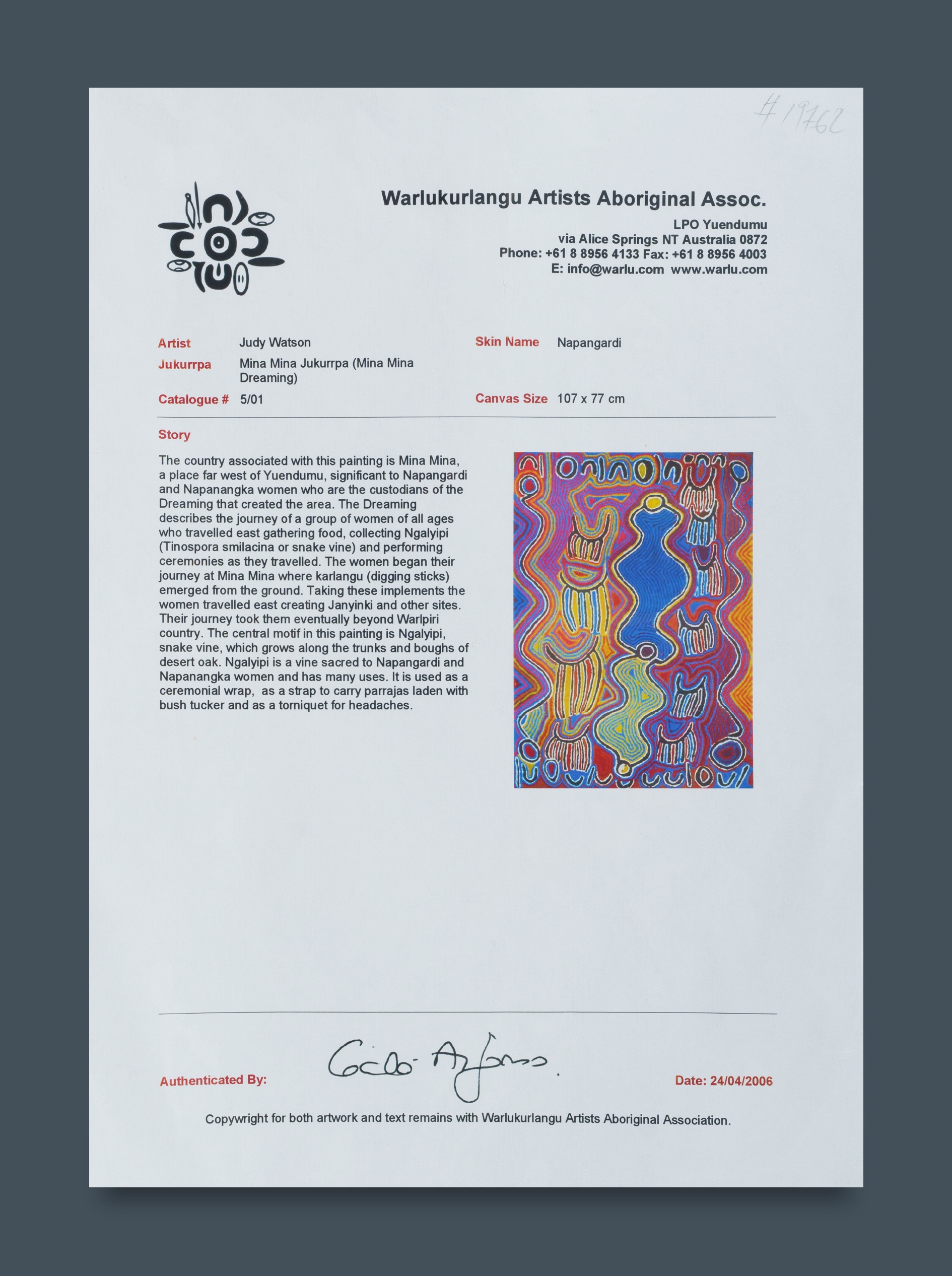NAPANGARDI, Judy Watson (Aboriginal c.1925-2016) 'Mina Mina Jukurrpa (Mina Mina Dreaming)' 2001. Inscribed verso. Acrylic on Linen 107x76cm PROVENANCE: Warlukurlangu Artists, NT, cat #5/01 (certificate of authenticity included); private collection, NSW.Estimate $1,500-2,500