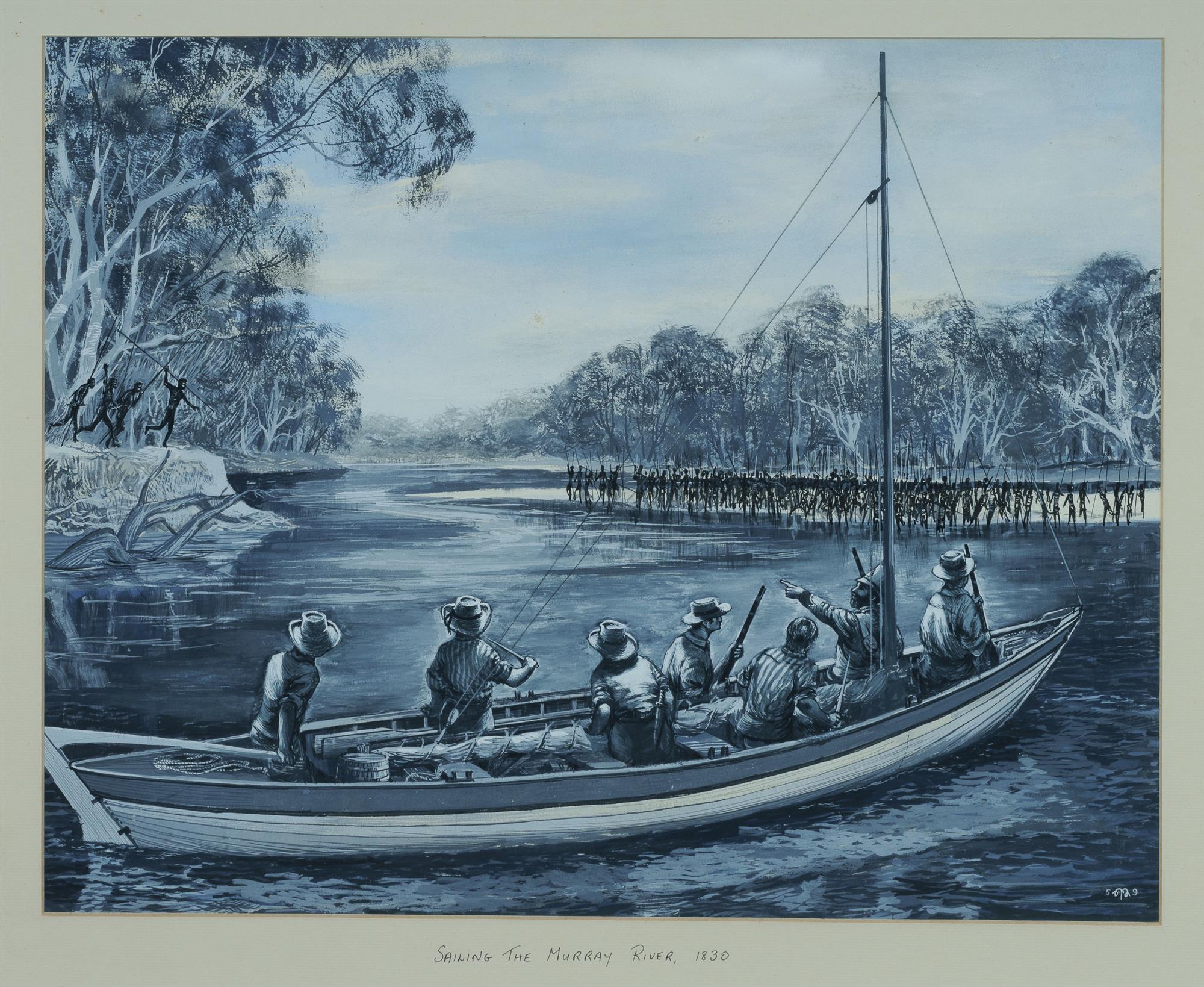 Australian School (2) 'Eureka, 1854' and 'Sailing the Murray River, 1830' Gouache (2) 37x48cm (each) PROVENANCE: The Fred and Elinor Wrobel Collection, Sydney; Estate Late Elinor Wrobel.Estimate $200-300