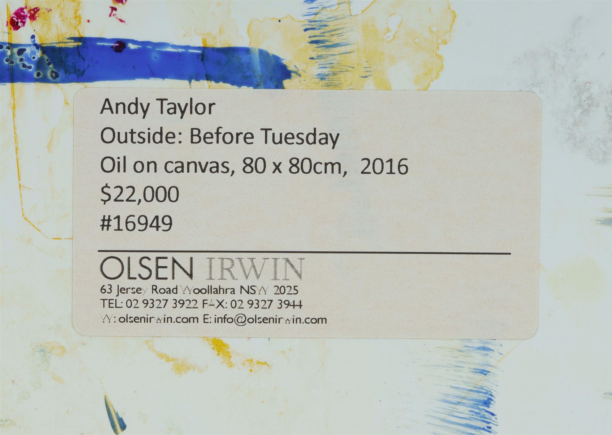 TAYLOR, Andrew (b.1967) 'Outside: Before Tuesday,' 2016. Ex Olsen Irwin Gallery, Woollahra, Sydney (label verso) Oil on Board 80x80cm PROVENANCE: Private collection, Sydney.Estimate $1,500-3,000