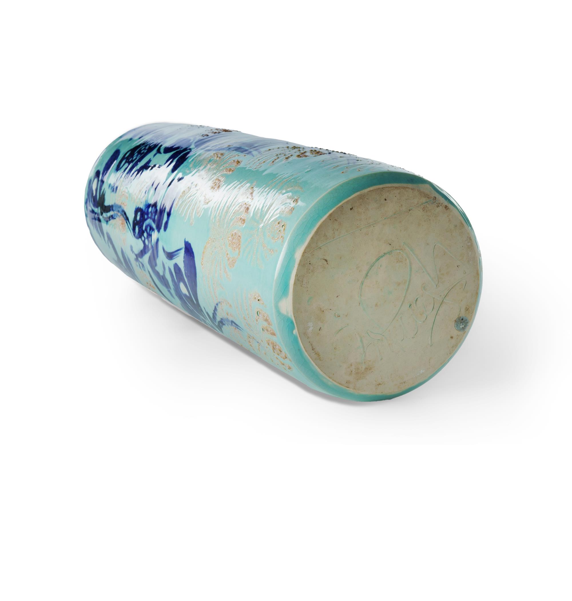 Michael PUGH Australian Pottery Umbrella Stand Pale blue glazed ground with cobalt frogs and flowers. Incised 'M. Pugh' to base. (H51cm Dia.16cm)Estimate $400-800