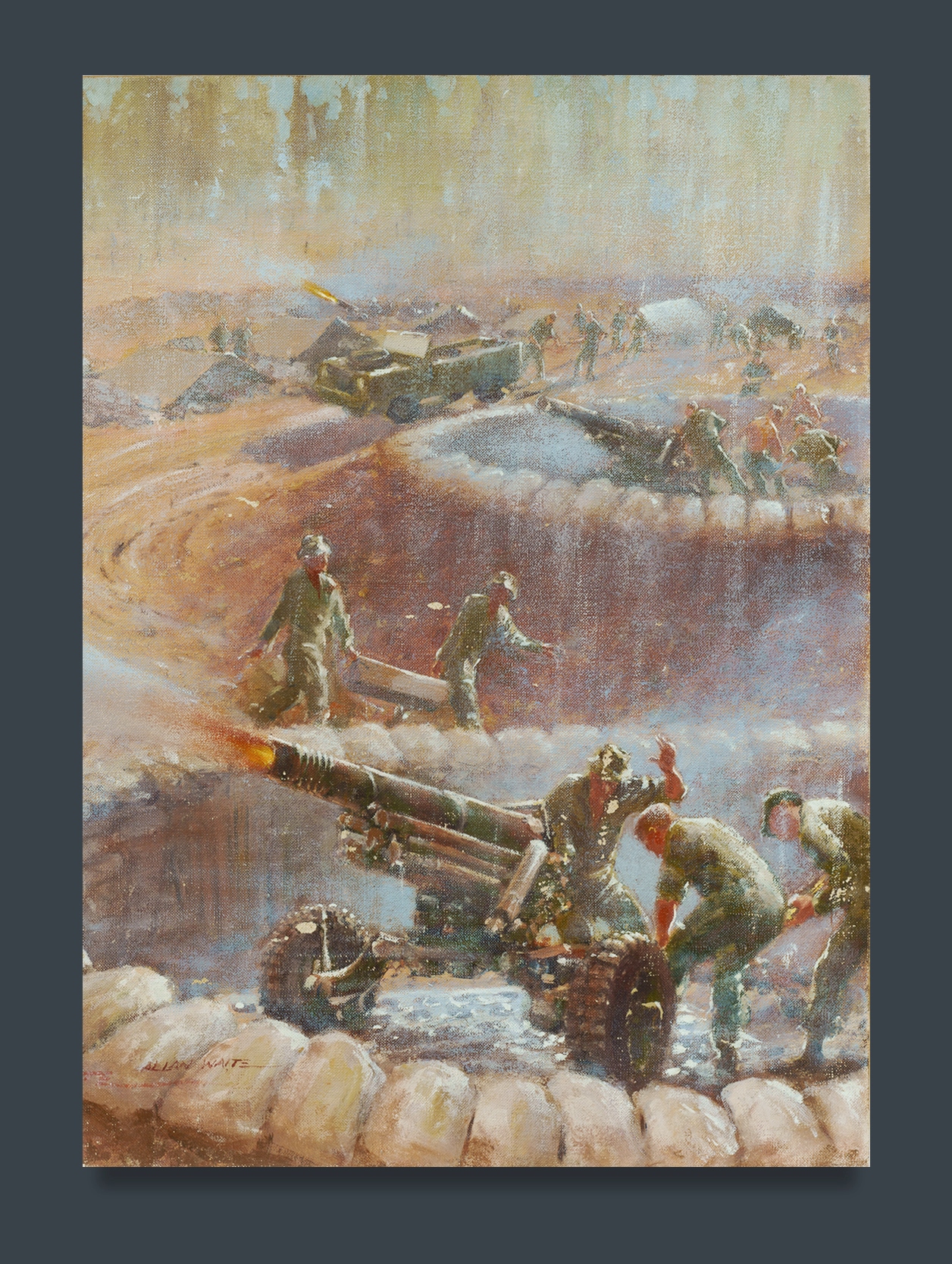 WAITE, Allan (1924-2010) (3) 'Study for Vietnam' (35x46cm); 'Sketch for Long Tan' (50x35cm); and Untitled, depiction of a 'Huey' helicopter, Vietnam (49x64cm) Oil on Canvas on Board (3)Estimate $150-300