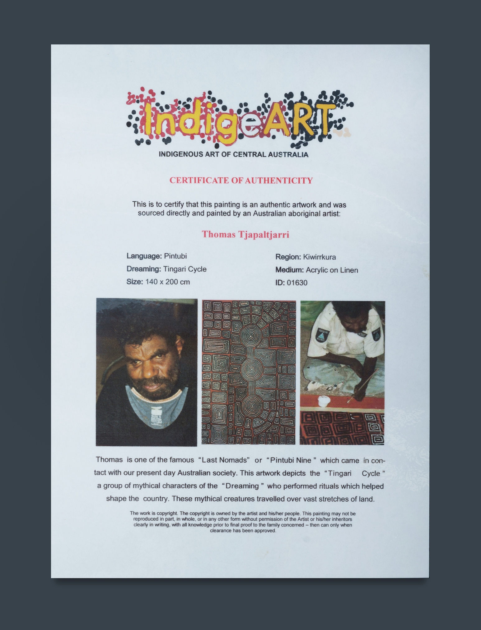 TJAPALTJARRI, Thomas (Aboriginal c.1964-2024) 'Tingari Cycle' Inscribed verso. Accompanied by certificate of authenticity from IndigeArt, Central Australia (#01630) Acrylic on Canvas 200x140cmEstimate $1,500-3,000