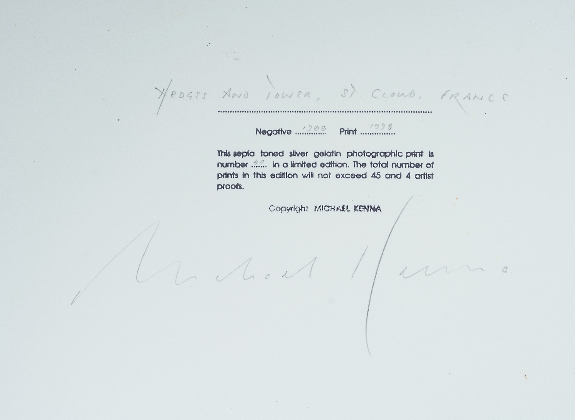 KENNA, Michael (British b.1953) 'Hedges and Tower, Saint Cloud, France,' 1988 (printed 1998) Signed lower right. Studio stamp with additional signature to mount verso. Sepia Toned Silver Gelatin Photograph 40/45 20x19.5cm (image) 50.5x41cm (mount) PROVENANCE: Private collection, Sydney.Estimate $1,000-2,000
