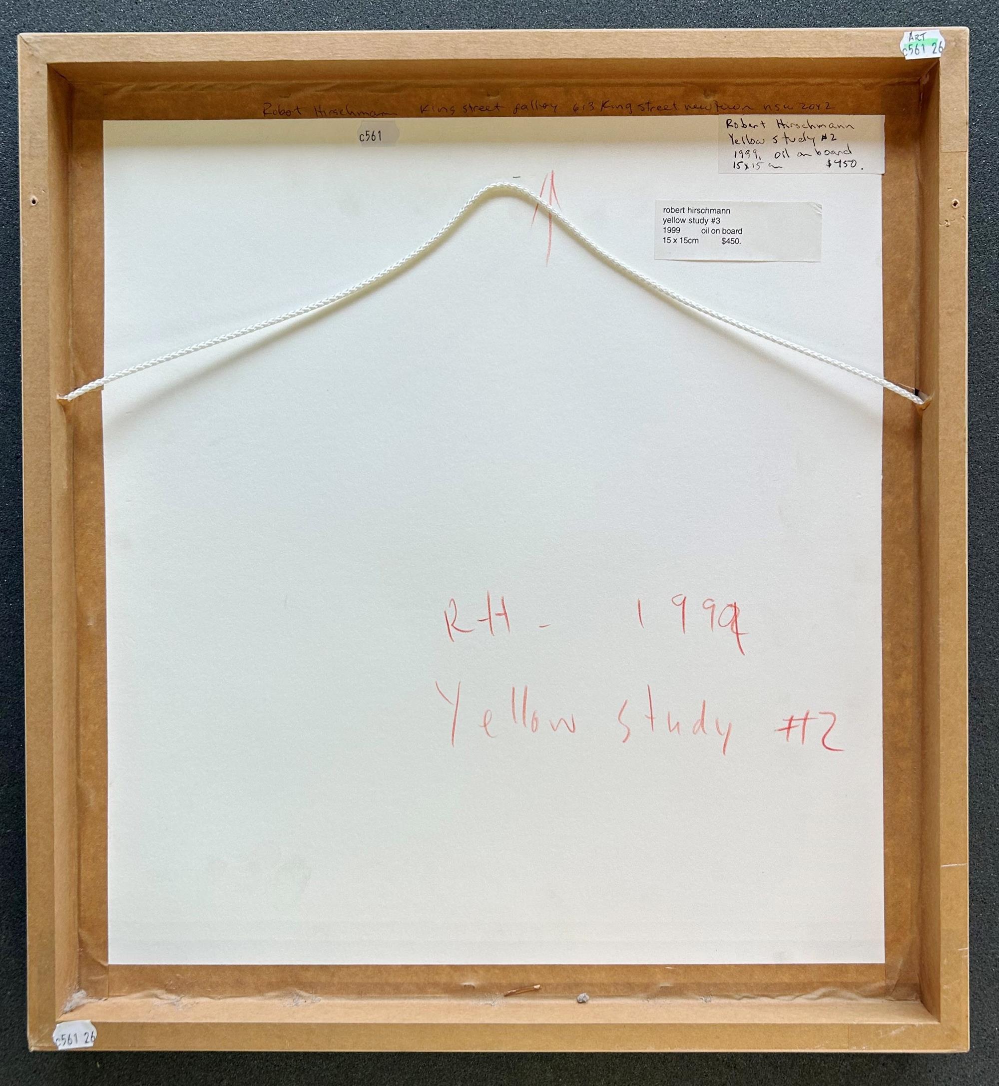 HIRSCHMANN, Robert (b.1968) 'Yellow Study #2,' 1999. Oil on Board 14.5x14.5cm PROVENANCE: King Street Gallery, Newtown, NSW (label & inscription verso); Collection Rev. Dr Arthur Bridge AM OAM.Estimate $300-600