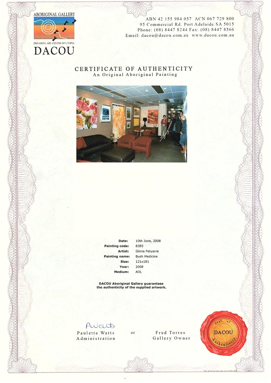 PETYARRE, Gloria (Aboriginal 1942-2021) 'Bush Leaf Medicine Dreaming,' 2008. Unsigned Acrylic on Linen 197x119cm PROVENANCE: Dacou Gallery NT, cat #8385 (copy of certificate available); private collection, NSW.Estimate $2,000-3,000