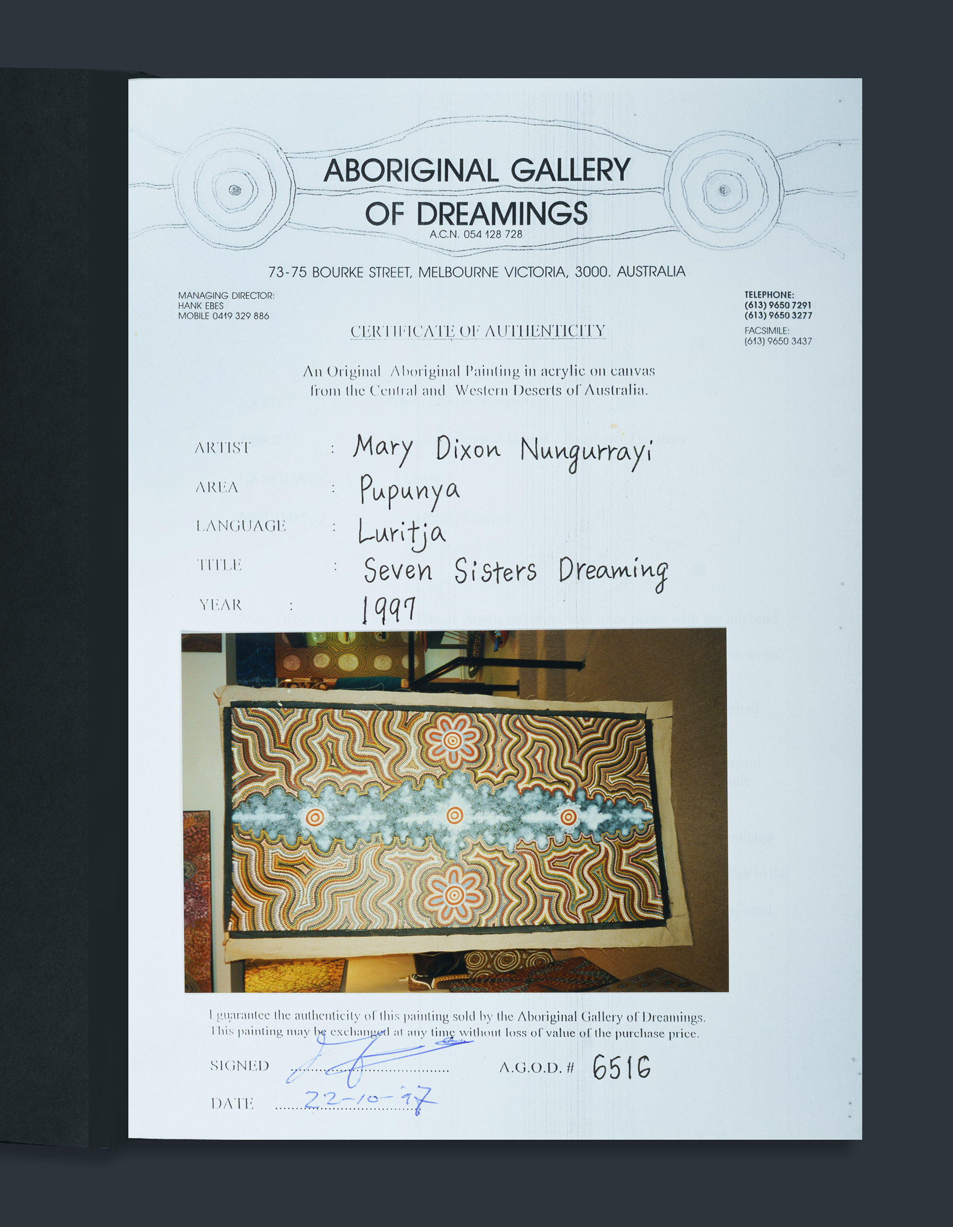 NUNGURRAYI, Mary Dixon (Aboriginal born c.1942) 'Seven Sisters Dreaming,' 1997. Signed verso. Acrylic on Linen 183.5x92.5cm PROVENANCE: Aboriginal Gallery of Dreamings, Melbourne, cat #6516 (certificate included); Collection Mr H & Mrs P Wallace, Sydney.Estimate $600-900