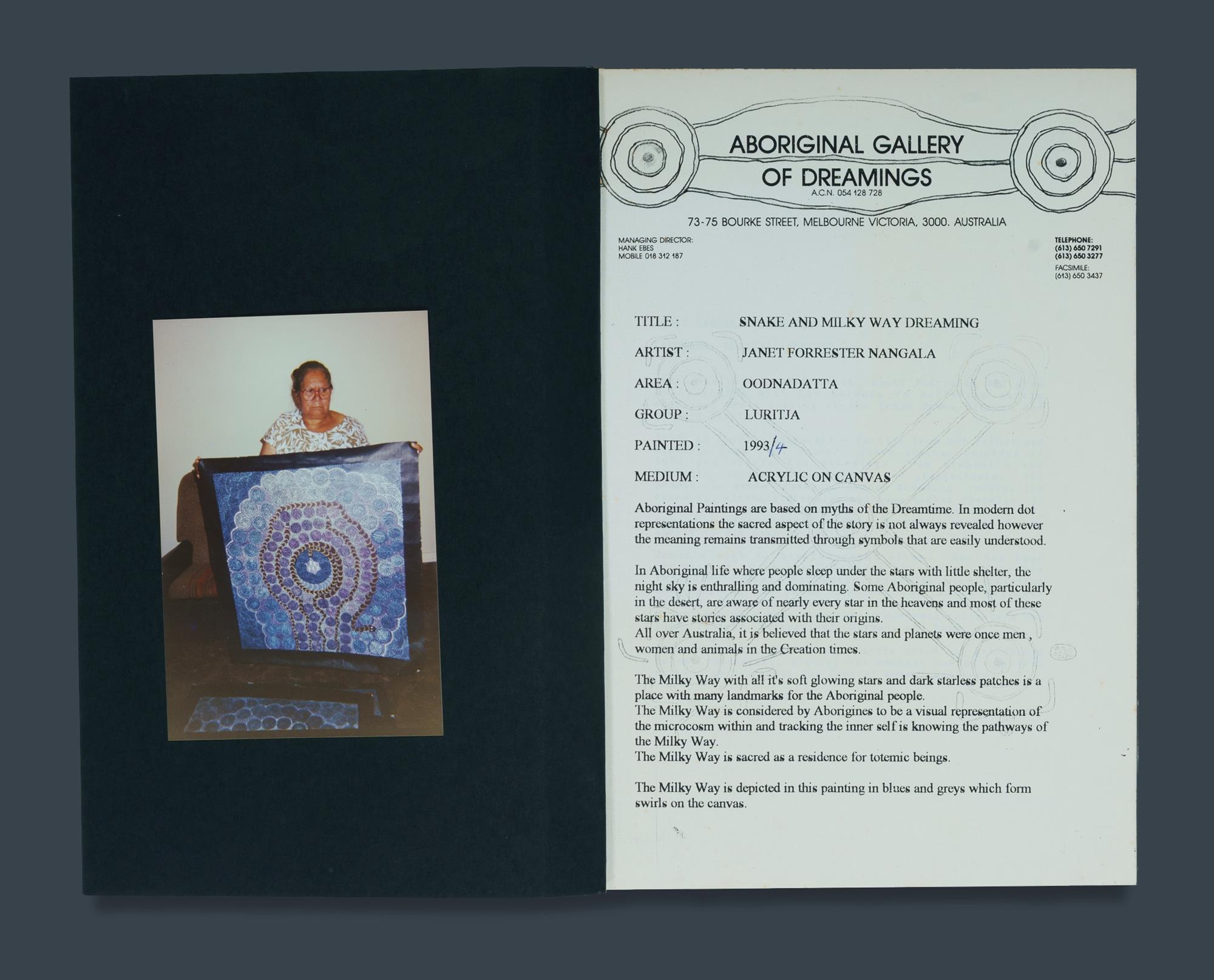 NGALA, Janet Forrester (Aboriginal b.1954) 'Snake and Milky Way Dreaming,' 1993-94. Acrylic on Canvas 92.5x79cm PROVENANCE: Aboriginal Gallery of Dreamings, Melbourne, cat #3403 (certificate included); Collection Mr H & Mrs P Wallace, Sydney.Estimate $200-400