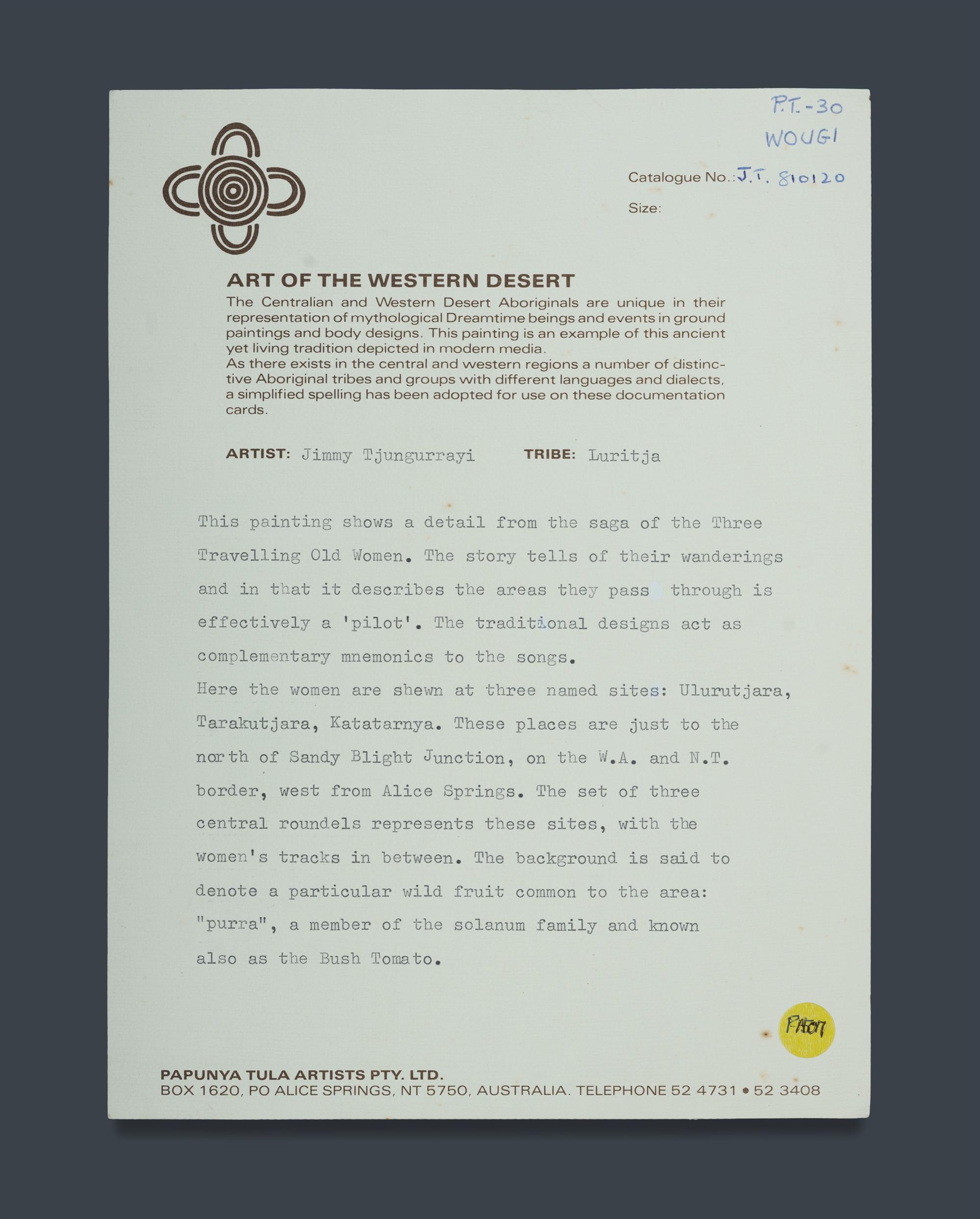 TJUNGURRAYI, Jimmy (Aboriginal School) 'The Three Travelling Old Women,' 1981. Acrylic on Linen 101x81cm PROVENANCE: Papunya Tula Artists, NT, cat #JT810120 (certificate included); Aboriginal Arts & Crafts Sydney (purchased 1981); Collection Mr H & Mrs P Wallace, Sydney.Estimate $500-800