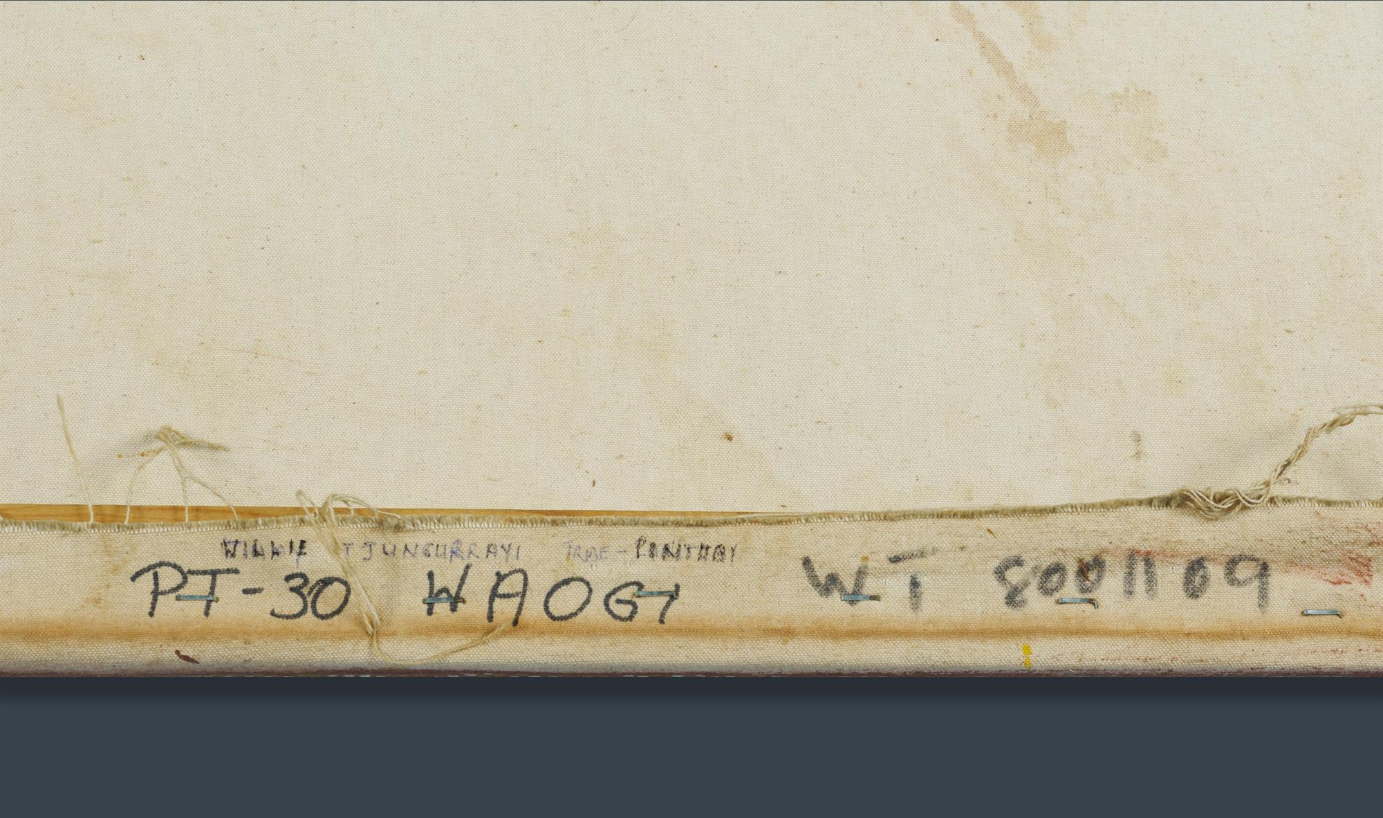 TJUNGURRAYI, Willy (Aboriginal c.1932-2018) 'Tingari Ceremonies at Keretinya,' 1980. Acrylic on Canvas 120x60cm PROVENANCE: Papunya Tula Artists, NT, cat #WT801109 (certificate included); Aboriginal Arts & Crafts Sydney (purchased 1981); Collection Mr H & Mrs P Wallace, Sydney.Estimate $1,800-3,500