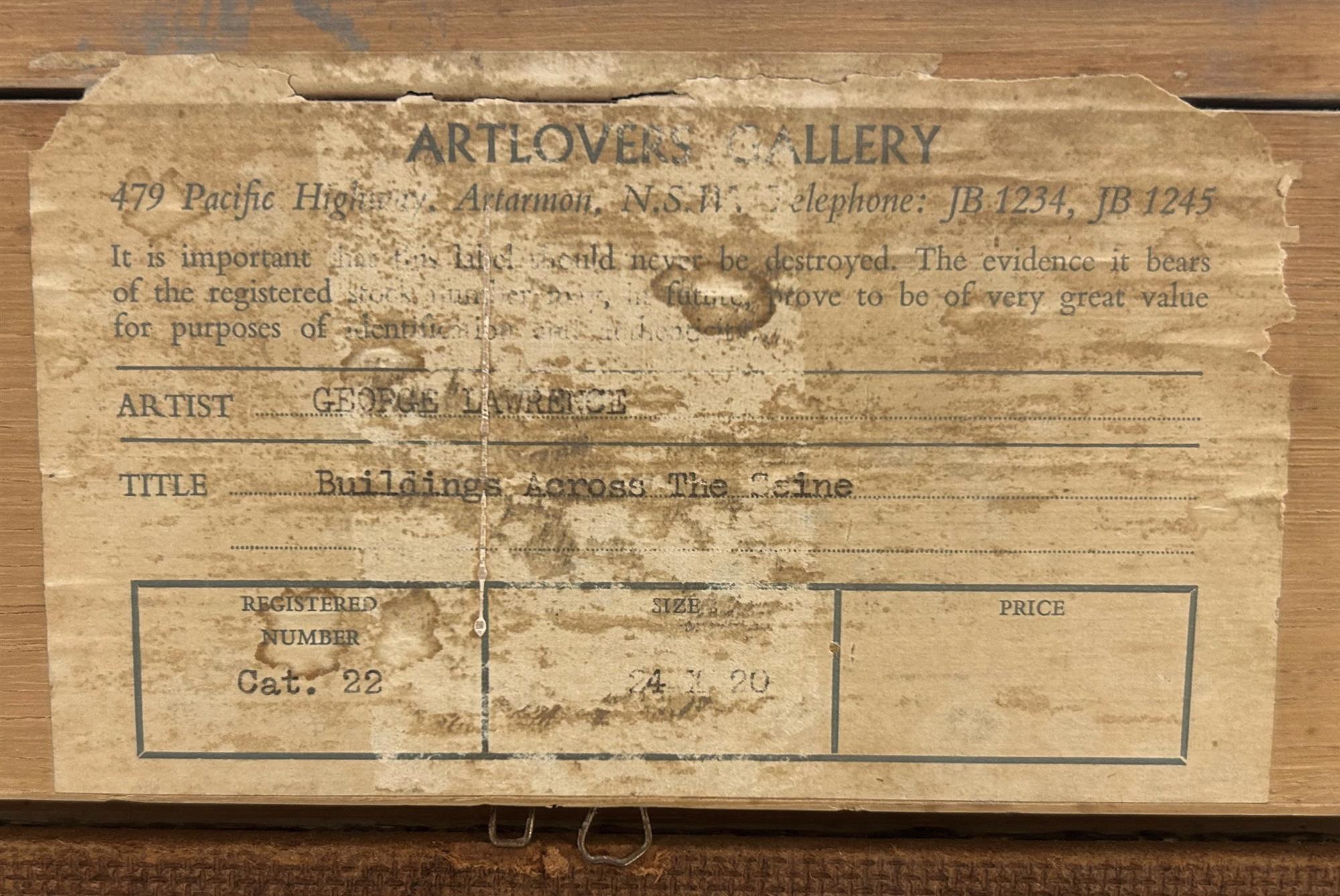 LAWRENCE, George Feather (1901-1981) 'Buildings Across the Seine,' 1953. Signed and dated lower right. Ex Artarmon Galleries, Sydney (label verso) Oil on Canvas on Board 50x60cmEstimate $700-1,200