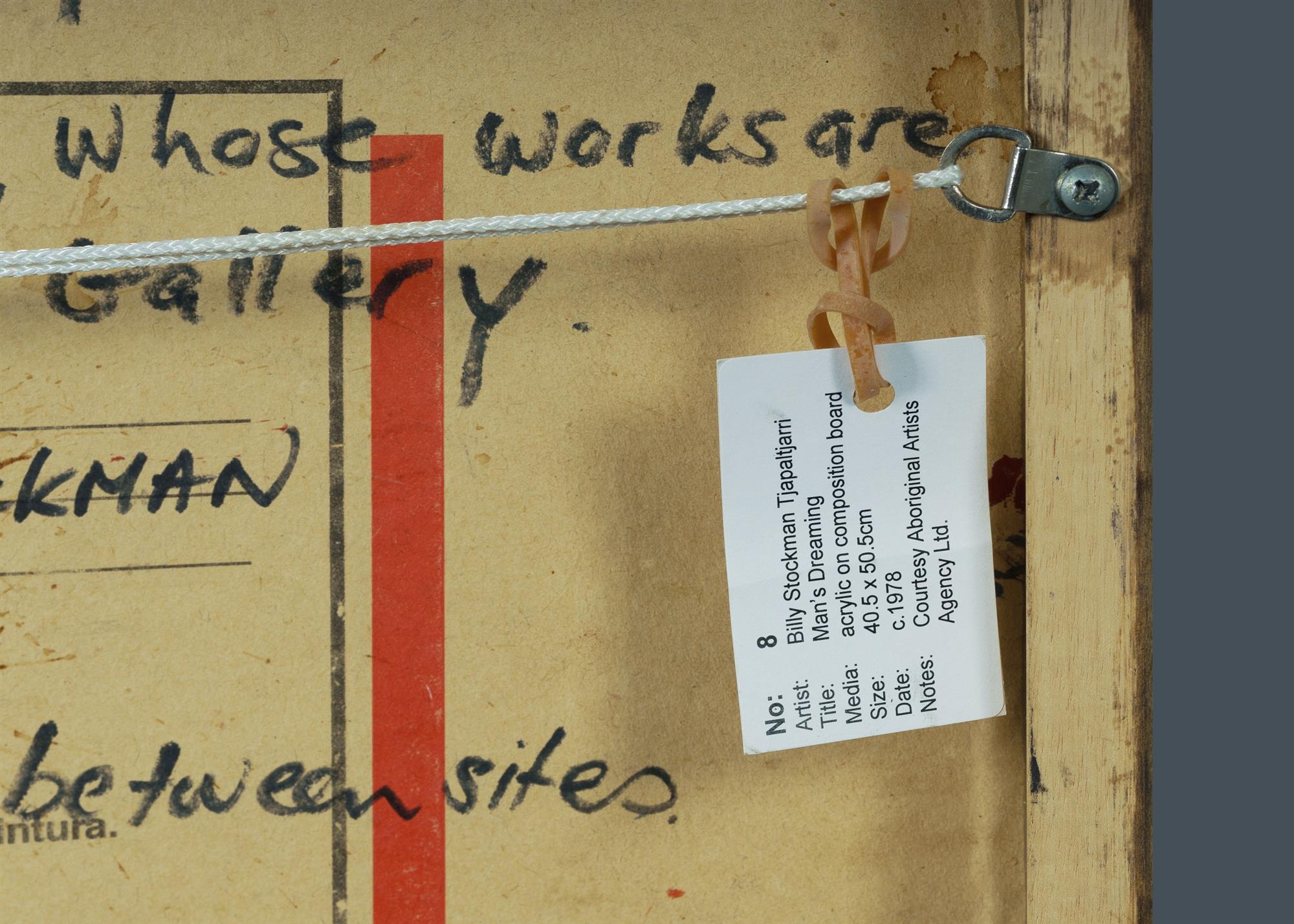 TJAPALTJARRI, Billy Stockman (Aboriginal 1927-2015) 'Man's Dreaming,' c.1978. Copious details inscribed verso. Acrylic on Canvas Board 40.5x50.5cm PROVENANCE: Ken Hinds Cultural Heritage Collection, Qld.Estimate $600-1,000