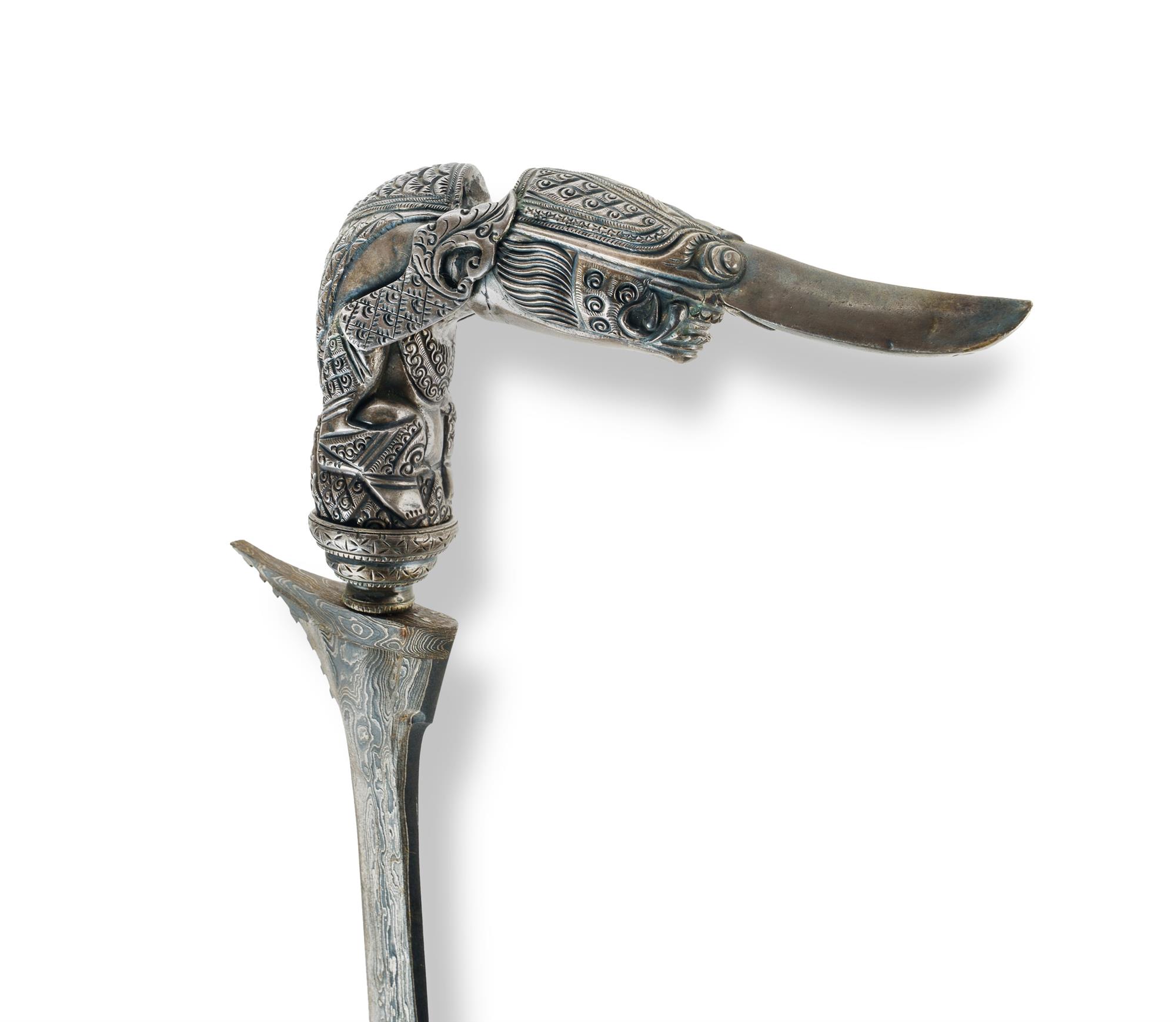 20th C. Indonesian Keris with Silver Hilt Long narrow pamor steel blade with a silver overlaid Tajong (Kingfisher) hilt. (L52cm)Estimate $200-300
