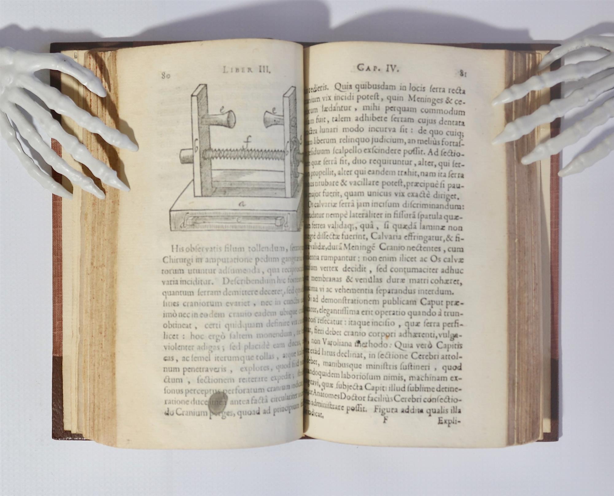 LYSER, Michael (1626-1659) Culter Anatomicus hoc est Methodus Brevis Facilis ac Persa Antificiosè and Compendiosè Humana Incidendi Cadevera; Cum nonnullorum Instrumentorum Iconibus. Accessit tertæ huic editioni Casper Bartholini Th. F. Administrationum anatoruicarum specimen. Pub. FRANCOSURTI (Frankfurt): Ex offecina Haffniensi Petri Hanboldi. Reginæ Acad Bibliopolæ, 1629. 237pp. with small woodcuts depicting instruments. Also addition of of 2 plates inadvertently bound in. Pencil note to f.f.e.p. by FWJ 'separated from other items with which it was bound by Bramhall and Menzies of Manchester, 1938'. It was originally bound up with ESHOLT: Clysmatica nova, but in separating this, Bramhall & Menzies also removed the tract by Bartholin mentioned on the title of Lyser's work and part of it. This too was bound separately and sold at Dawson's to John Crerar Library, Chicago. However the two plates belonging to Bartholin, were left in Lyser. Half brown morocco (modern) by Bramshall & Menzies with brown woven paper. Lyser's work is a manual for dissecting the body and showing the necessary instruments. 1938 rebinding in half calf with linen boards. Contents overall quite clean and straight. Frederic Wood Jones book label, and final bookplate of K.F. Russell. (156x94mm)