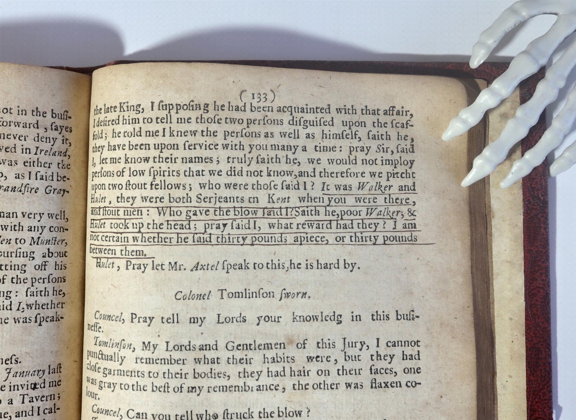 Regicide of CHARLES I Heneage Finch (Earl of Nottingham). An Exact and most Impartial Accompt of the Indicment Arraignment, Trial and Judgement (according to law) of Twenty Nine REGICIDES, Murtherers of the late SACRED MAJESTY of Most Glorious Memory: Began at Hicks-Hall on Tuesday 9th October 1660 and Continued (at the Sessions-House in the Old Bayley) until Friday, the Nineteenth of the Same Month. Together with a SUMMARY of the Dark, and Horrid decrees of those Caballists, Preparatory to that Hellish Fact. Exposed to view for the Reader's Satisfaction, and Information of Posterity. LONDON: printed for Andrew Crook at the Green Dragon in St Paul's-Church-yard, and Edward Powel at the White-Swan in Little-Britain, 1660. Collation - [2], 48 p., 49-56 leaves, 57-148, 153-287 p. Text continous despite pagination. Rebound in full red calf. Text is heavily toned with marks and stains throughout. Top of title page has earlier restoration. Worming to bottom of a section of around 80 pages, not overt. The third leaf has in contemporary hand an index of the Regicides & 'Anne Rodes, Booke.' Second leaf with previous owner, 'J. Froggatt, Lenton 1853.' Also 'George Ellis' to title page. Underlining, page 233. Bookplate: Ex Libris K.F. Russell. (196x145mm)