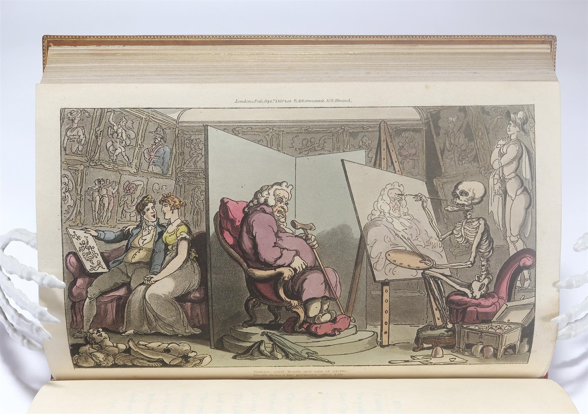 ROWLANDSON, Thomas. The English Dance of Death, from the Designs of Thomas Rowlandson, with Metrical Illustrations by the Author of "Doctor Syntax" Pub. LONDON: Printed by J. Diggens, St. Ann's Lane; Published at R.Ackermann's Repository of Arts, 101, Strand; and to be had of all the book and print-sellers in the United Kingdom. 1815. Note: Volume 1 only of issued 2 volumes. Brief collation, 158 leaves; pp. [11] iv-vii [6] 2-295 [1]. Includes 37 hand coloured aquatints. Thirty six poetic vignettes with accompanying tissue protected plates. Themes include; The Undertaker and the Quack, The Honey Moon, The Sot, The Insurance Office, etc. Binding by Tout in full brown calf with a gold ruled boards. Full gilt text block. Preliminaries foxed, occasional toning throughout text but overall a very good straight and unhandled copy. Bookplate for Alfred Lee, book label for K.F. Russell. (234x145mm)