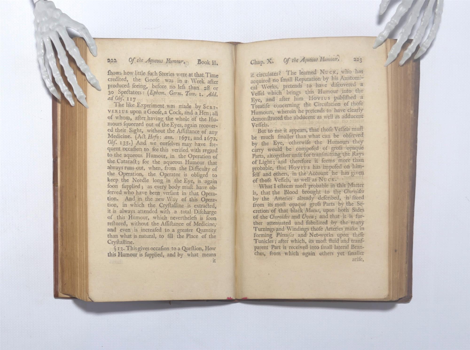 PORTERFIELD, William. A Treatise on the Eye, the Manner and Phaenomena of Vision in Two Volumes. Volume 1 (only) Pub. EDINBURGH: Printed for A. Miller at London and for G. Hamilton and J. Balfour at Endinburgh. MDCCLIX (1759) Title, pp [i]-xxxi, [1] leaf, 450pp., [1] leaf :: 5 plates. Porterfield was M.D. and Fellow of the Royal College of Physicians of Edinburgh. He obtained his M.D. at Rheins in 1717. He matriculated at Leyden in 1718 and studied there under Boerhaave. In 1728 the Royal College of Physicians of Eninburgh recommended the Town Court to appoint Porterfield as professor of physic and this was done in 1724. No evidence that he ever gave any lectures. Russell British Anatomy 671 ESTC T60564. Spine and front corners later repaired with leather. Spine label with losses. Contents toned, Title page heavily affected, otherwise fairly clean and straight. Plates toned, one with a soiled and crushed edge. (197x122mm)