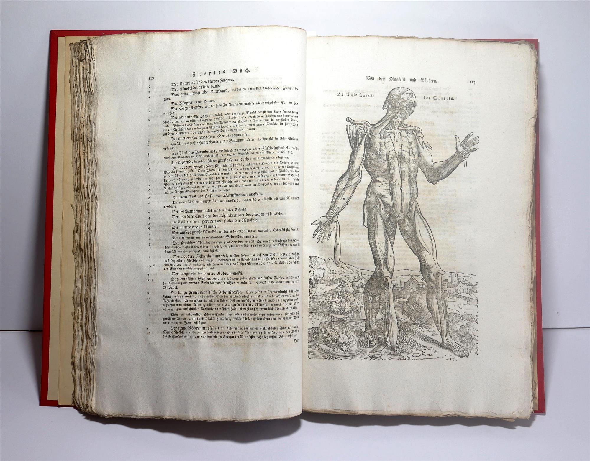 Vesalius' acclaimed anatomy book is considered a milestone in anatomic book art. For a long time, authorship of the illustrations was unknown. Today, it is regarded certain that they were made by the Dutchman and student of Titian, Jan Stephan van Calcar. For the purpose of printing, the woodcut stocks were transported from Venice to Basel. As of 1706, they had been in possession of the printer Andreas Maschenbauer in Augsburg. Half a century later the plates went into ownership of the Bavarian physician Johann Anton von Wolter, who intended to supply the illustrations with German text in order to "have a useful anatomy book for Bavarian surgeons, which, illustrated with such exquisite figures, would be a perfect guideline." In order to put this plan into practice, Heinrich Palmaz Leveling, a professor for anatomy at the Bavarian State University in Ingolstadt, was eventually commissioned. Leveling faced the challenge to endorse the more than 200 years old anatomic illustrations with a German text that was supposed to reflect latest anatomic knowledge. He much drew upon the 'Abhandlung von dem Bau und der Zergliederung des menschlichen Leibes' published by the anatomist Jakob Winslow (1669-1760) in 1754. The biggest challenge for Leveling presumably was to employ German terminology exclusively, that is why he added a 'Verzeichnis der gemeinsten, in diesem Werke vorkommenden Kunstwörter' (glossary of terms) in which he translated every Latin term into German. The original woodblocks remained in possession of the Bavarian State University and came via Landshut to Munich, where they were printed 1934 in a bibliophile edition with Latin text for the last time. Ten years later, all woodblocks burned in an air raid over Munich. (Source: Ingolstadt, Medizin-Historisches Museum).