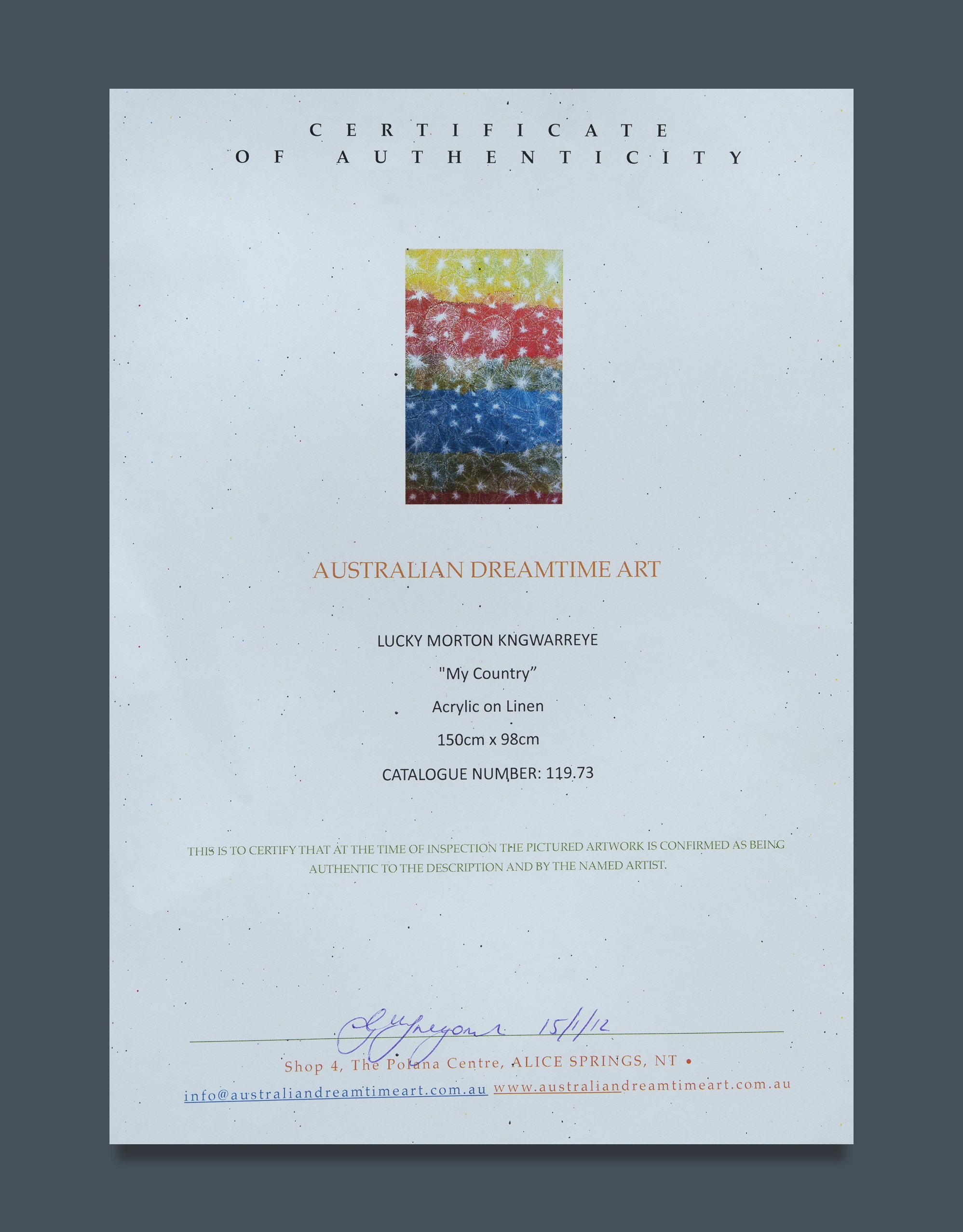 KNGWARREYE, Lucky Morton (Aboriginal born c.1952) 'My Country,' 2011. Signed verso. Acrylic on Linen 150x98cm PROVENANCE: Australian Dreamtime Art, NT cat #119.73 (stamp verso and accompanied by certificate of authenticity) Estimate $700-1,200