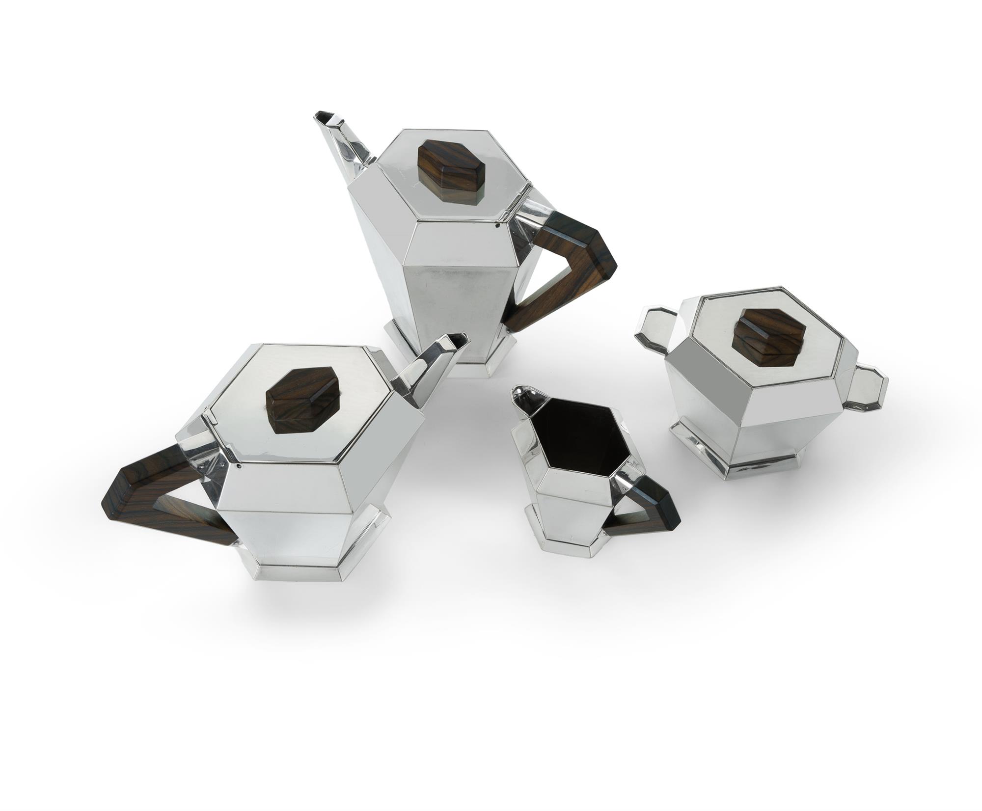 French Art Deco White Metal Tea Set Comprising 4 pieces, hexagonal in shape with Macassar ebony handles and knops. Stamped to base of each with chess piece, model number, and 'METALBLANC'. Likely by Christofle. H18cm (tallest) Estimate $800-1,200