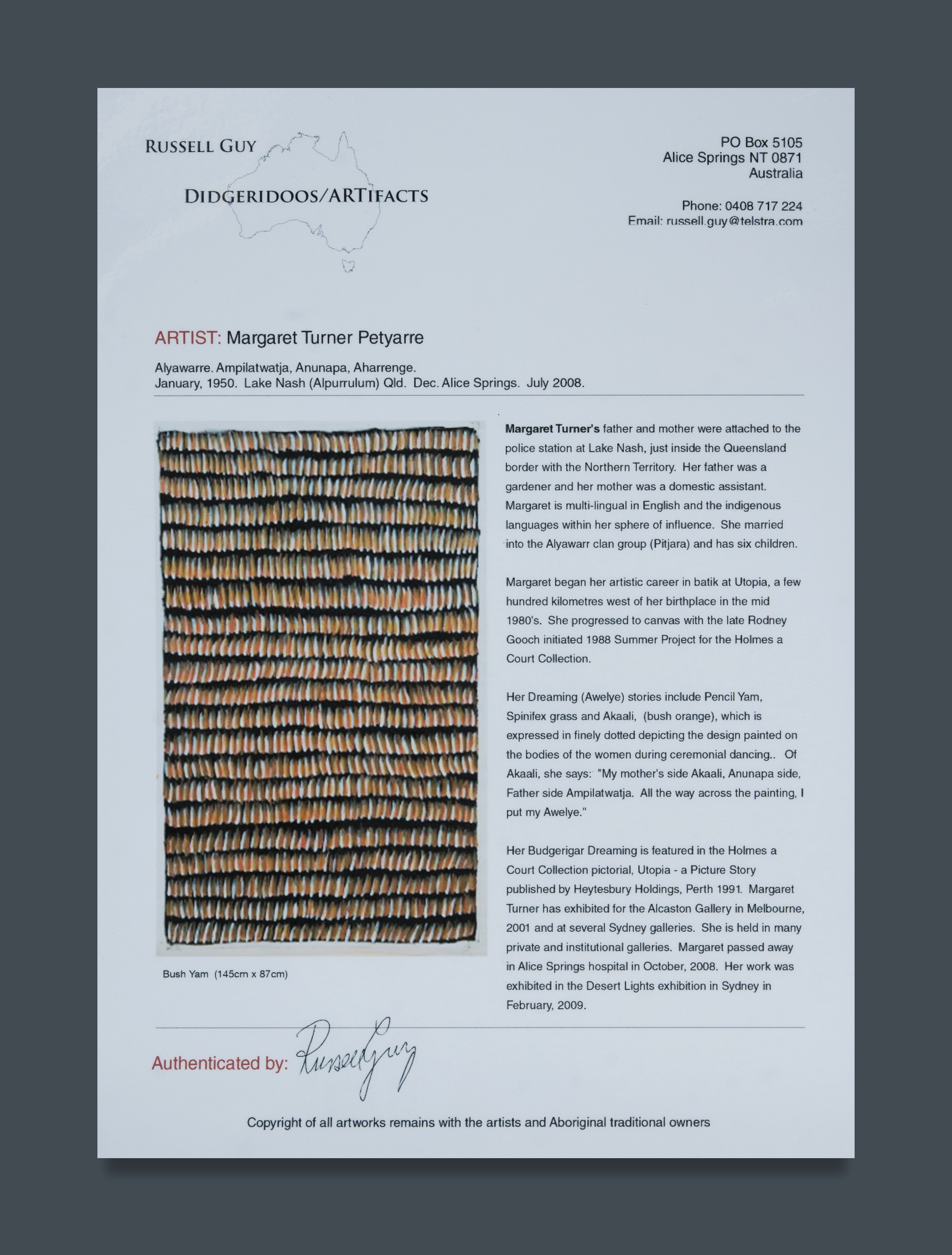 PETYARRE, Margaret Turner Price (Aboriginal 1950-2008) 'Bush Yam Seed,' 2004. Signed and inscribed verso: DBG/HBT TURM 04-0506. Acrylic on Canvas 145x87cm (image) PROVENANCE: Russell Guy, Didgeridoo / Artifacts, NT (certificate of authenticity supplied)Estimate $200-400