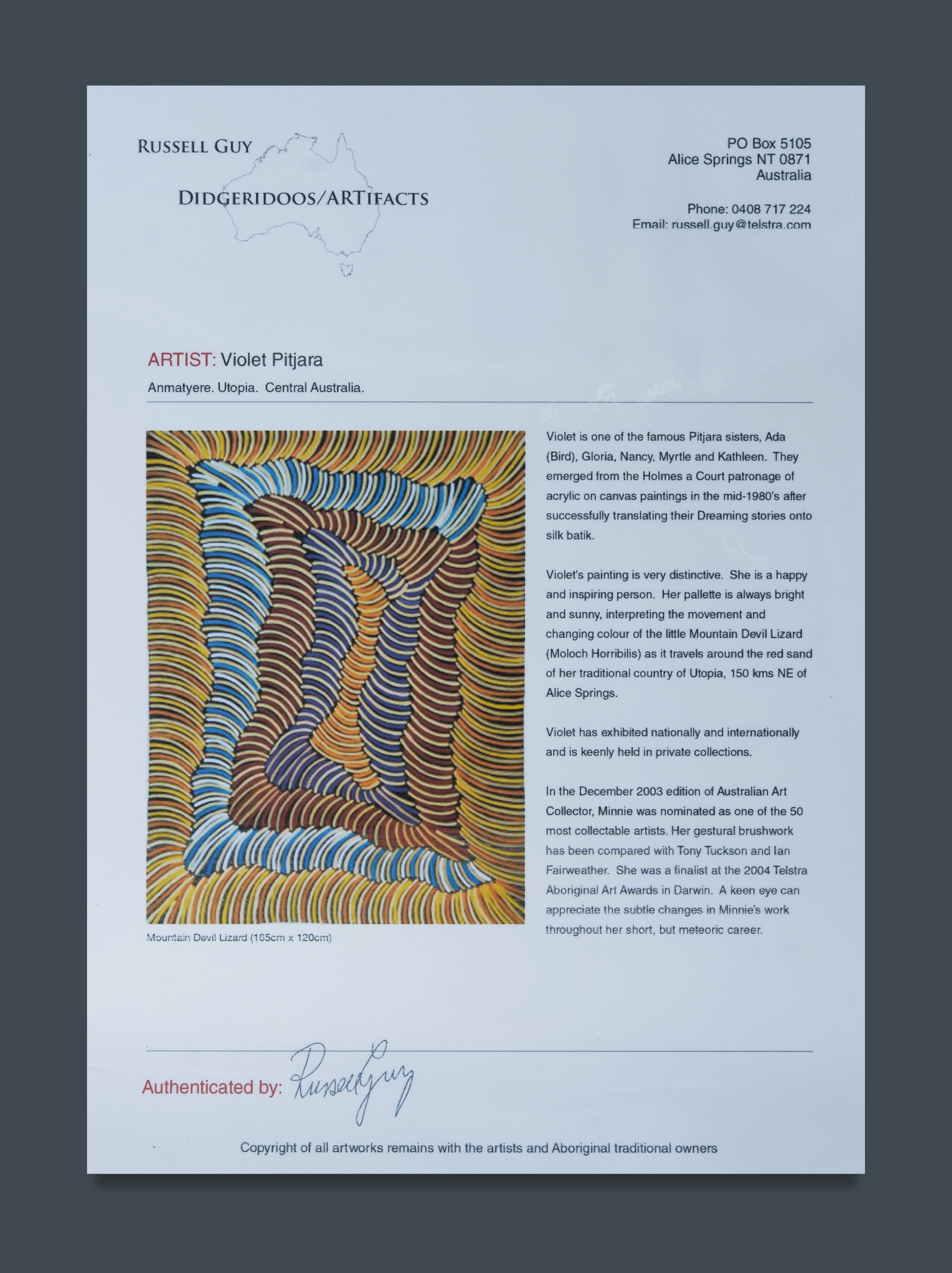 PETYARRE, Violet Pitjara (Aboriginal born c.1945) 'Mountain Devil Lizard,' 2003. Signed and inscribed verso: DBG/HBT PITV 01-0506. Acrylic on Linen 162x122cm (image) PROVENANCE: Russell Guy, Didgeridoo / Artifacts, NT (certificate of authenticity supplied)Estimate $400-700