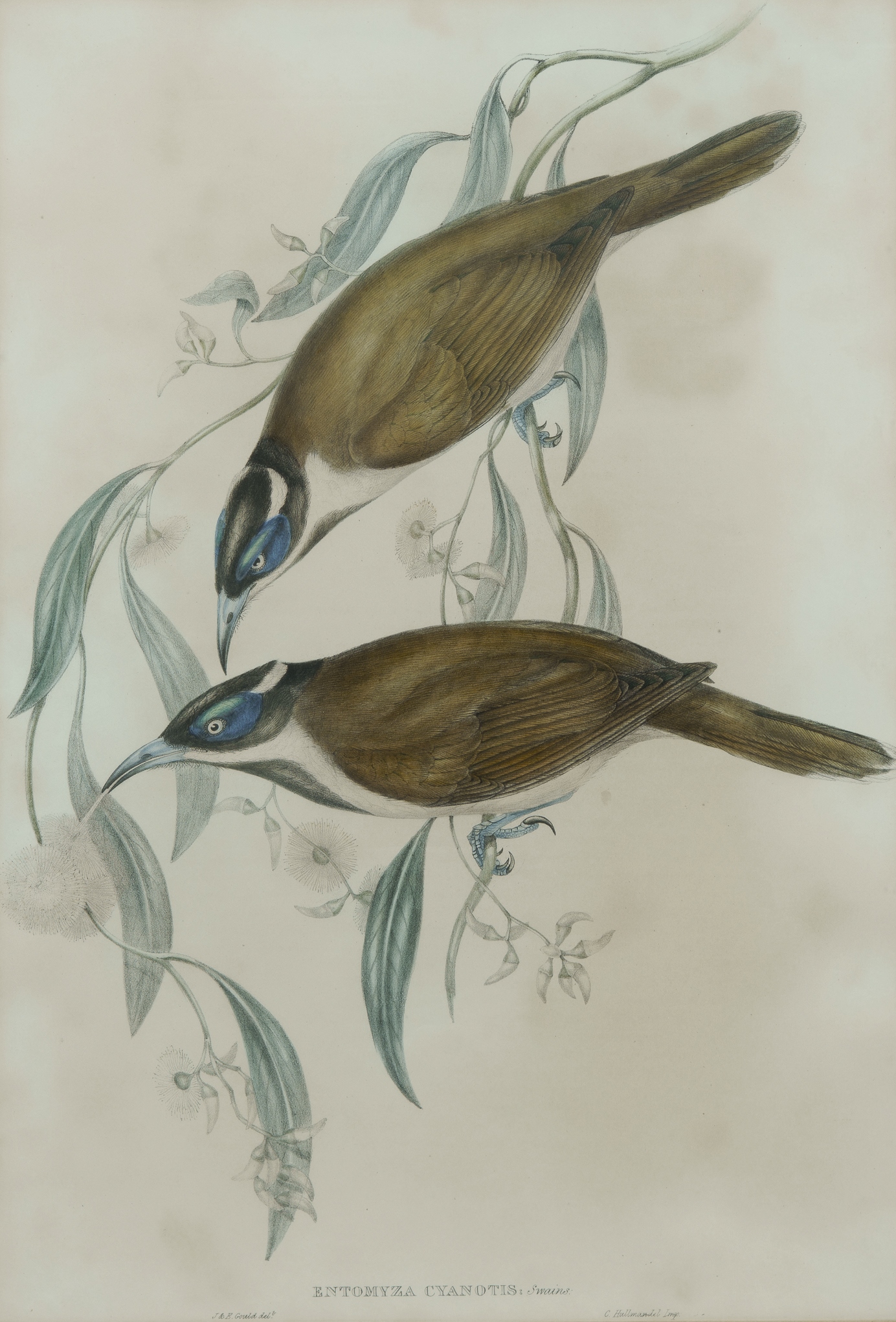 GOULD, John (1804-1881) (3) 'Orthonyx Spinicaudus: Temm (Australian Logrunner)', 'Entomyza Albipennis (White-Pinioned Honeyeater)', and 'Entomyza Cyanotis: Swains (Blue-Faced Honeyeater). Description sheets attached verso for the latter two. Hand Coloured Lithograph (3) 50x34cm (largest)