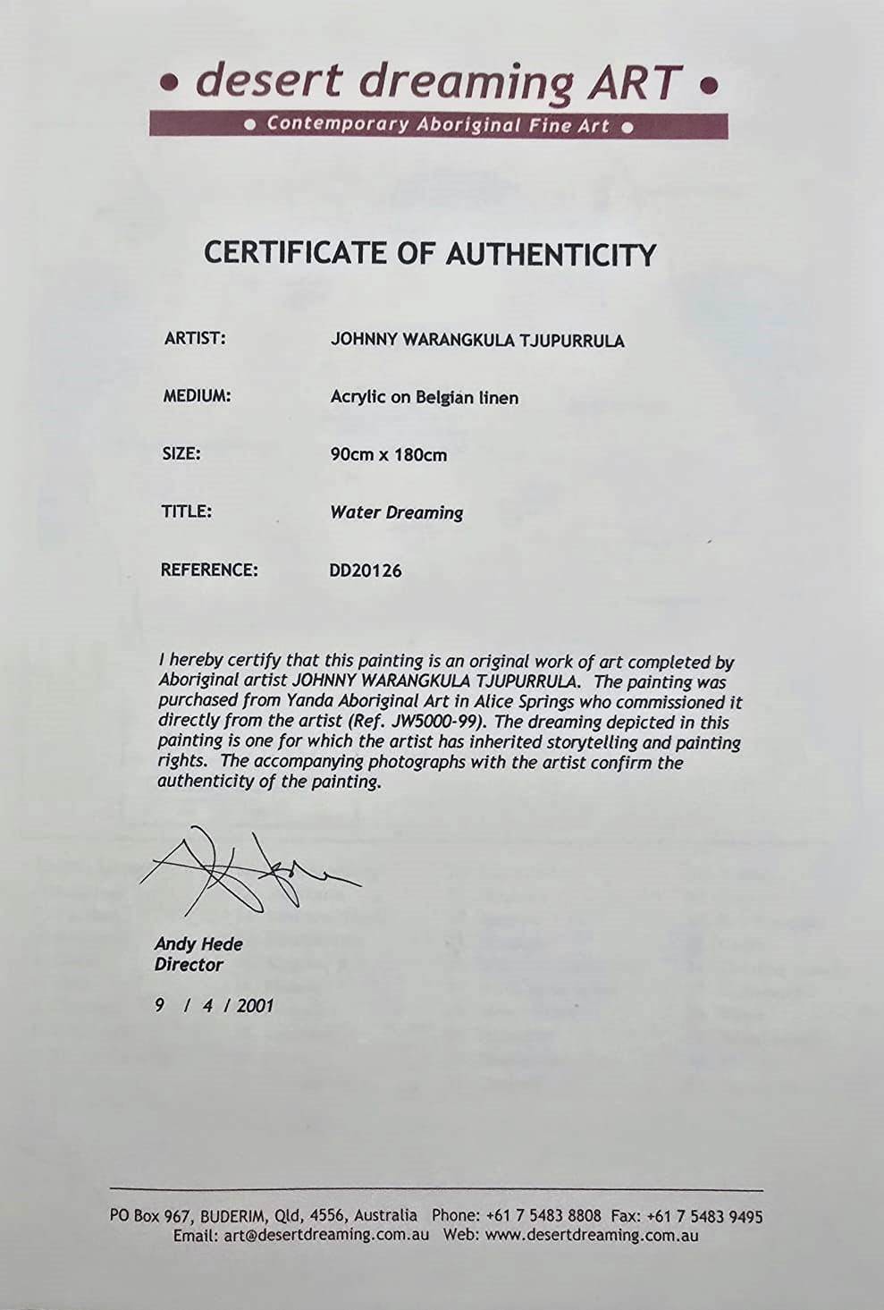 TJUPURRULA, Johnny Warangkula (Aboriginal c.1925-2001) 'Water Dreaming,' 1999. Inscribed verso with artist's name. Acrylic on Linen 183x92cm PROVENANCE: Yanda Aboriginal Art, cat#JW5000-99 (inscribed verso); Desert Dreaming Art, Buderim, Qld, cat#DD20126 (certificate of authenticity & numerous work in progress photos); Ken Hinds Cultural Heritage Collection, Qld.Estimate $1,500-3,000
